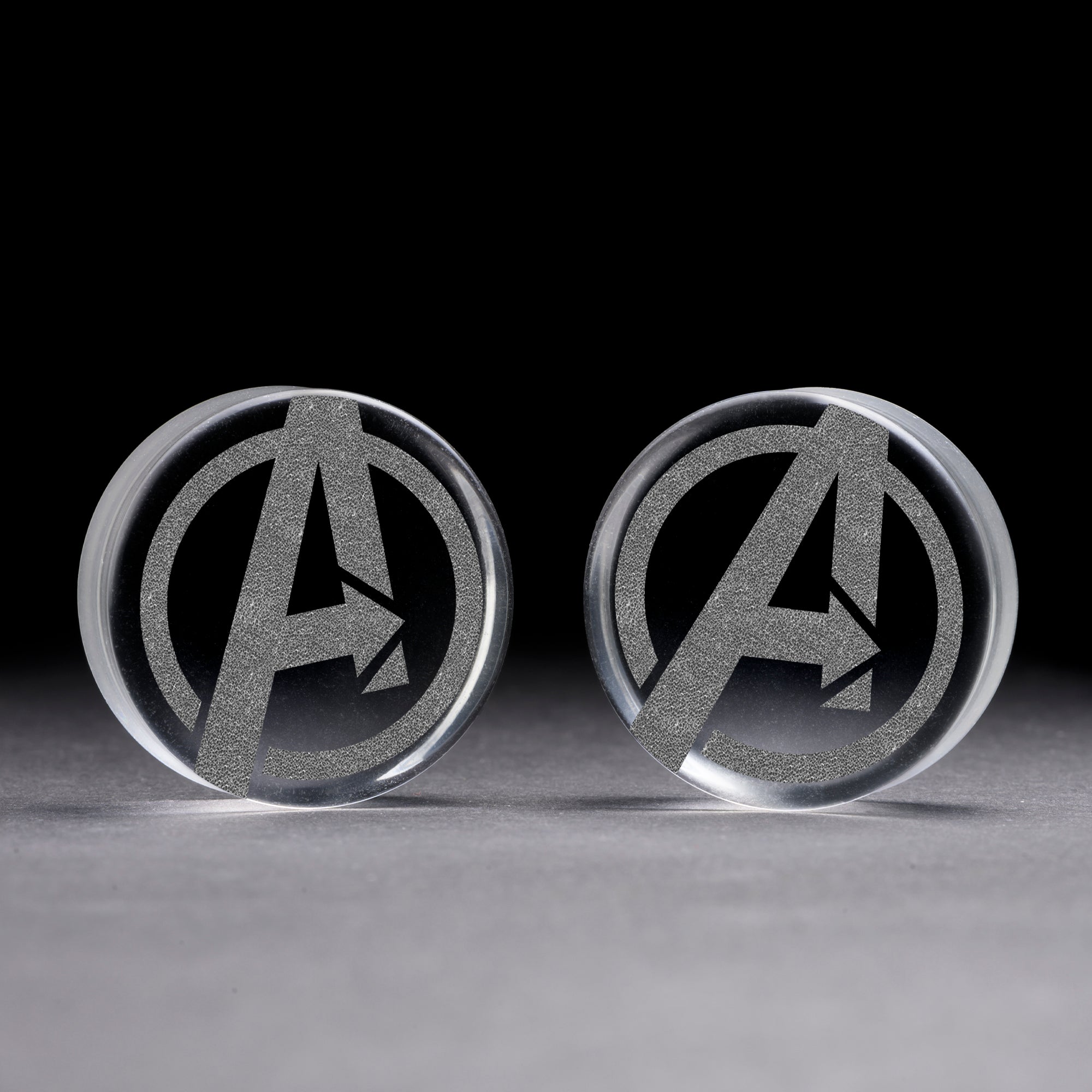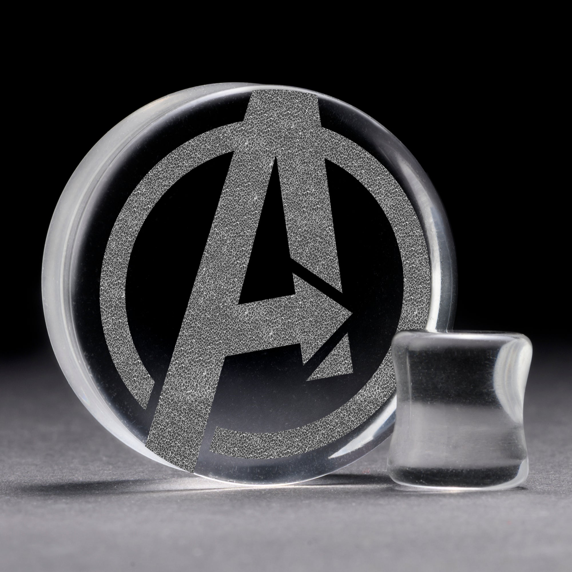 flach ‚Faced doppeltes, klar, Glasplug mit unserem lasergravierten" Avengers " Design.