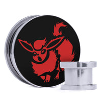 Limitierte Auflage, Hohe Qualität Silberstahl Doppelt geflanschte Schraubverschluss-Plugs mit schwarzer & roter Einlage und lasergraviertem Design Pokemon "Flamara"