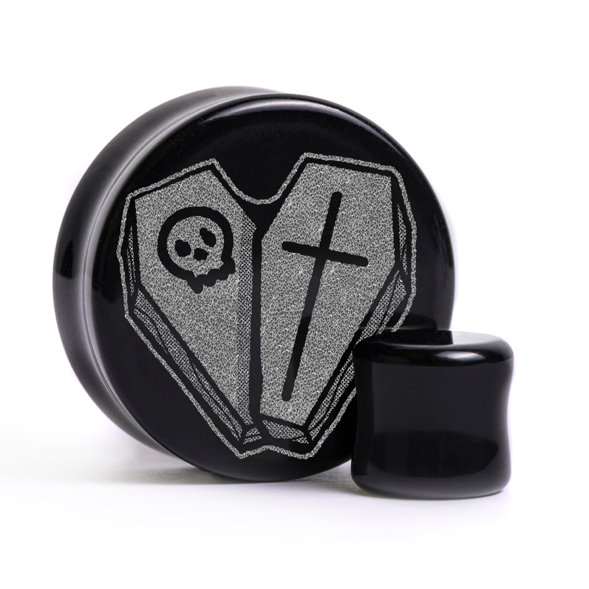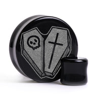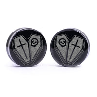 Begrenzte Auflage Flachgesicht Doppelt geblähte schwarze Glas-Plugs mit unserer lasergravierten “Herz-Sarg design. Dieses Produkt ist Teil unserer Halloween-Promotion