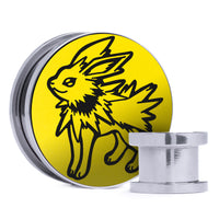 Limitierte Auflage, hochwertige Silberstahl Double Flare Screw Back gelb & schwarz Inlay Plugs mit dem lasergravierten Pokemon "Jolteon"