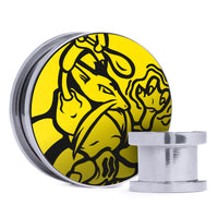 Limitierte Auflage, hochwertige Silberstahl Double Flare Screw Back Yellow & Black Inlay Plugs mit dem lasergravierten Pokemon "Kadabra"