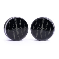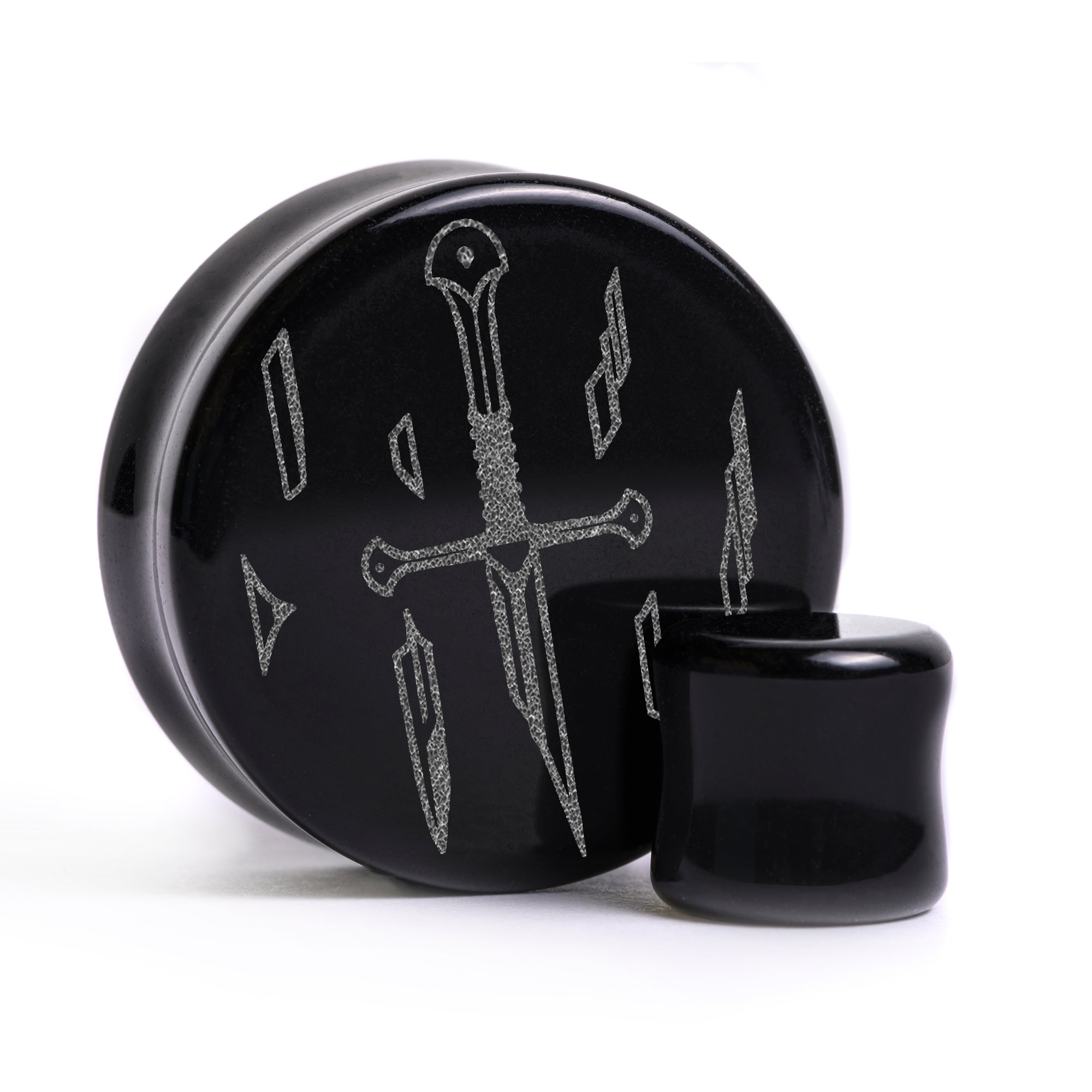 Flachgesicht Doppelt geblähte schwarze Glas-Plugs mit unserer lasergravierten “LOTR Narsil zerbrochener Schwert" design.