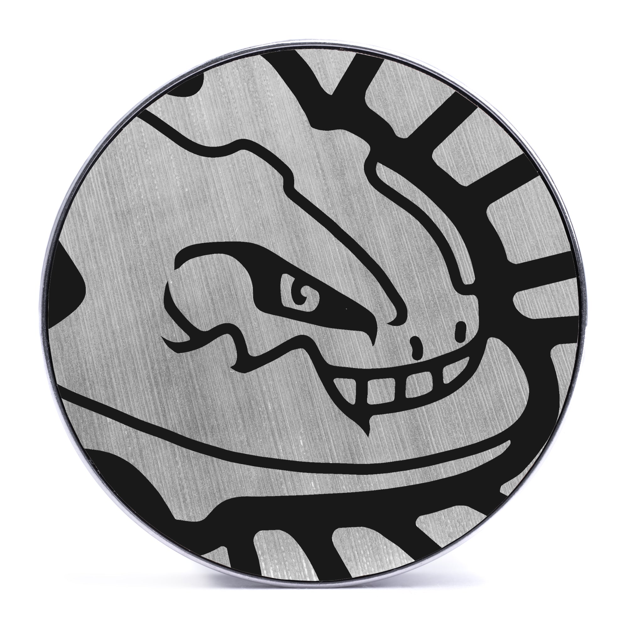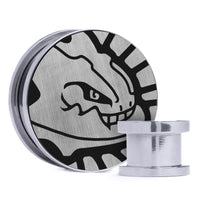 Limitierte Auflage, hochwertige Silberstahl Double Flare Screw Back Plugs mit gebürsteter Silber- & Schwarz-Einlage, versehen mit dem lasergravierten Pokemon "Steelix"