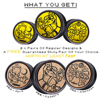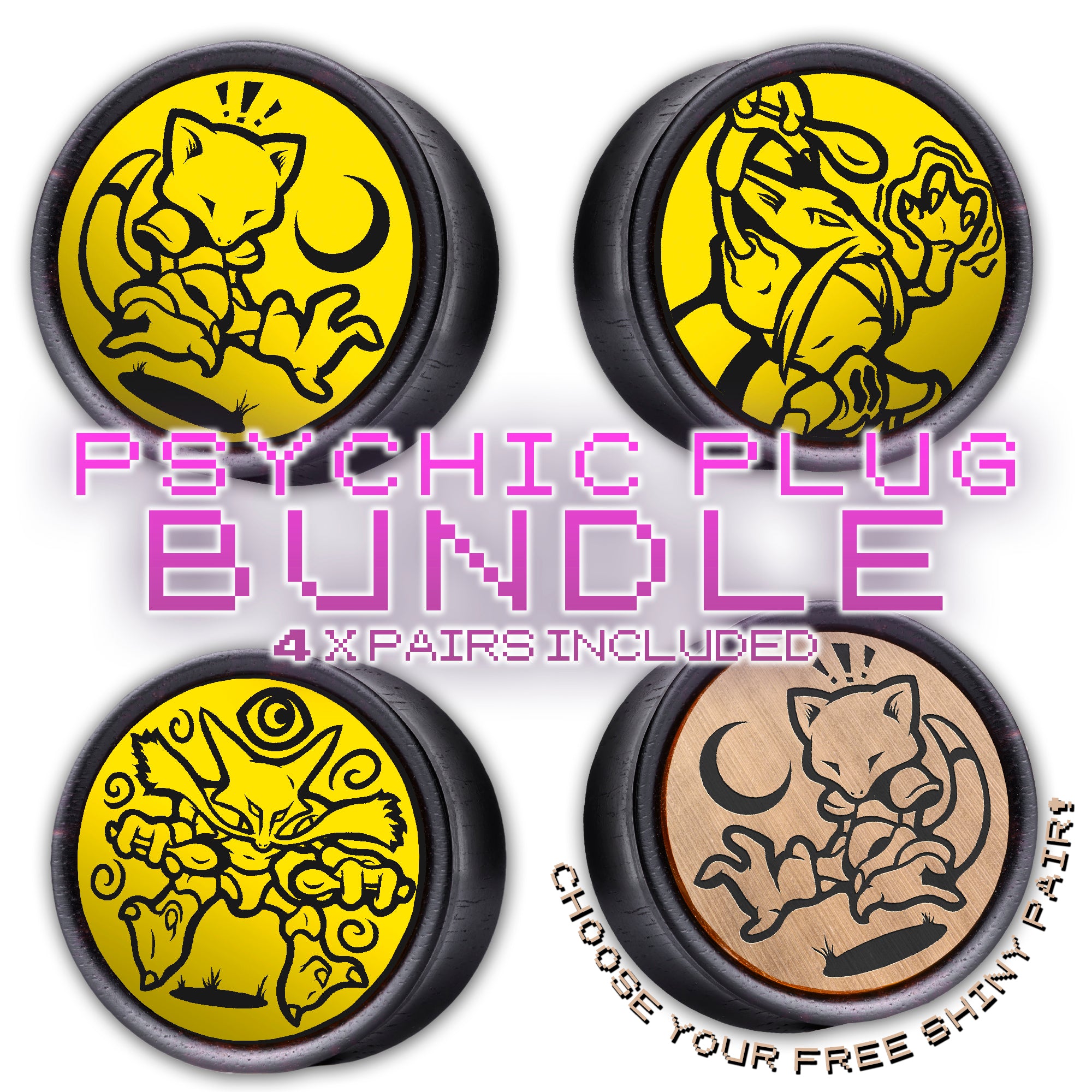 3 der Paare sind gelb-schwarze Inlay-Plugs mit Abra, Kadabra und Alakazam sowie 1 FREI ein Paar GLÄNZENDE INLAY-STECKER Ihrer Wahl. Welches Psycho-Pokémon wirst du auswählen??