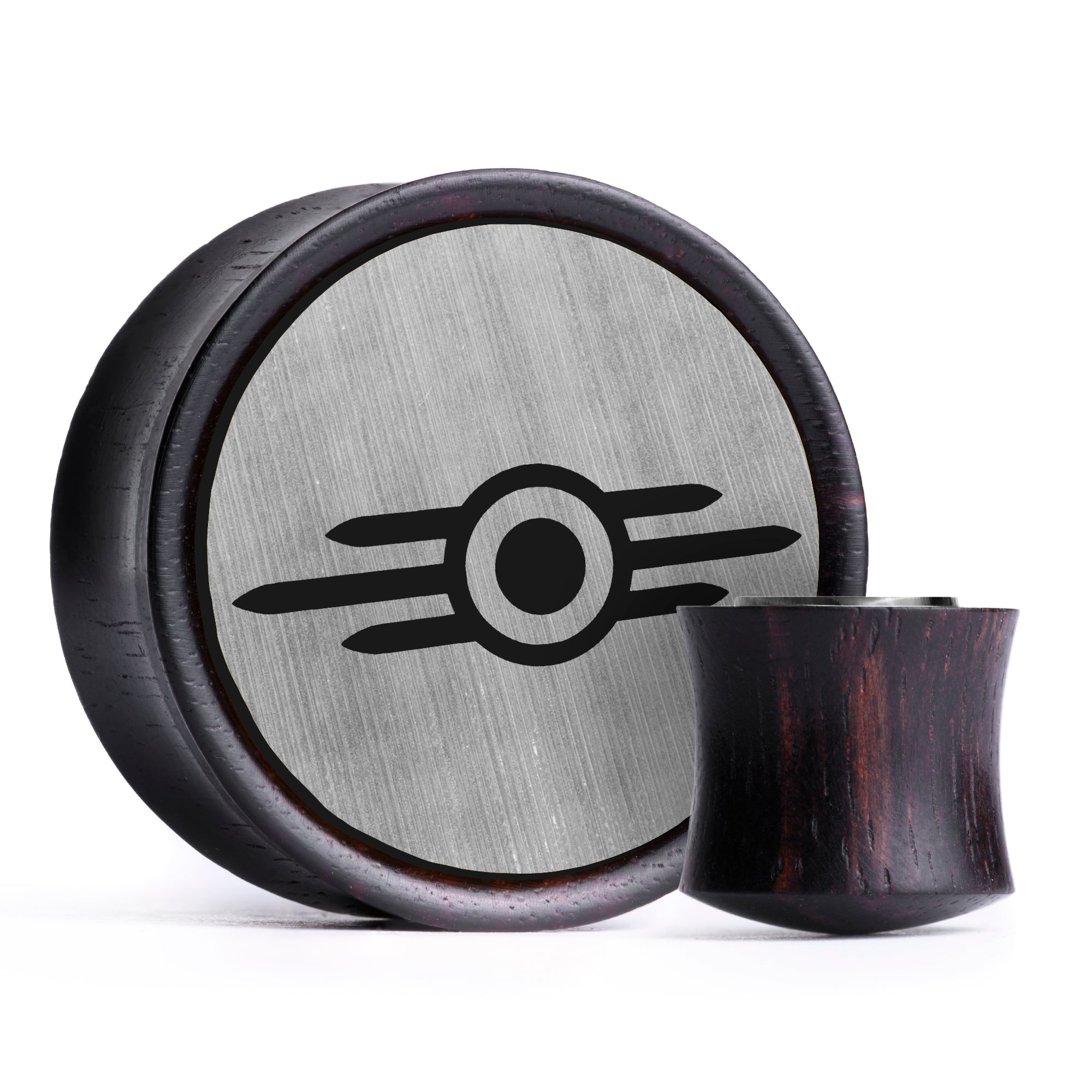 Limitierte Auflage: Doppelt geflanschte Ebenholz Plugs mit gebürstetem Silber & schwarzem Inlay aus Holz, versehen mit dem lasergravierten "Vault-Tec Logo"