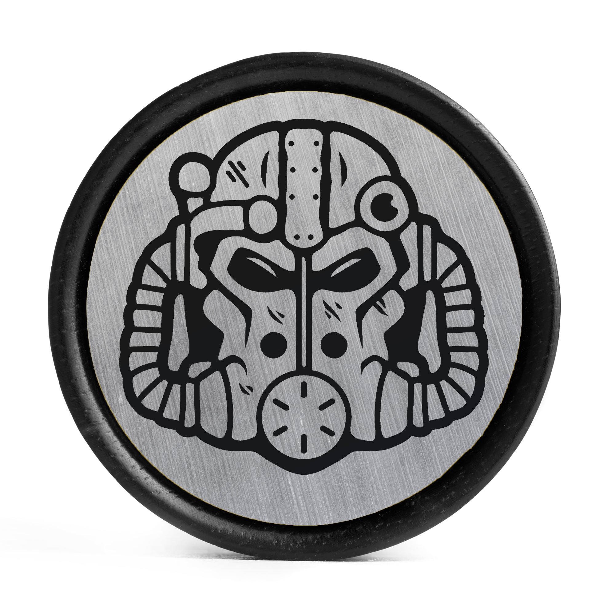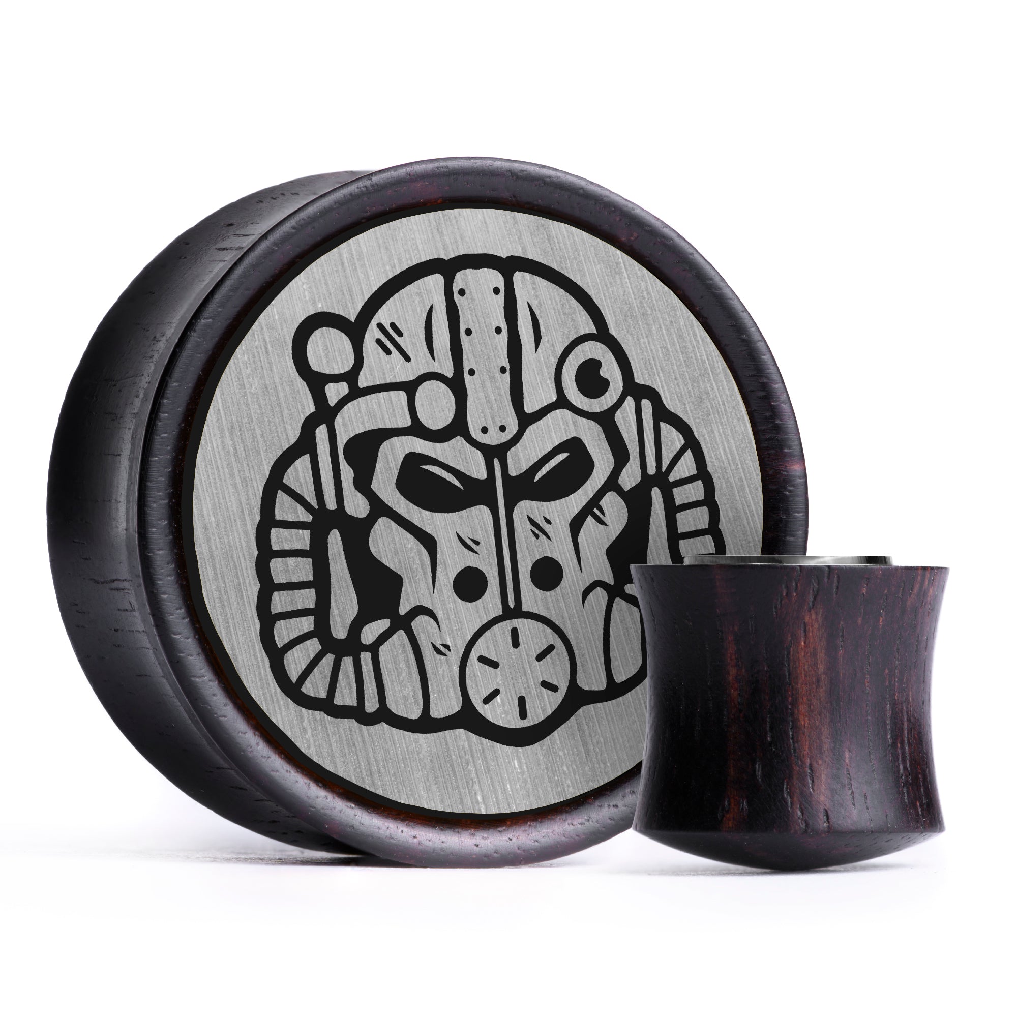 Limitierte Auflage: Doppelt geflanschte Ebenholz Plugs mit gebürstetem Silber & schwarzem Inlay aus Holz, versehen mit dem lasergravierten "Power Armor Helmet"