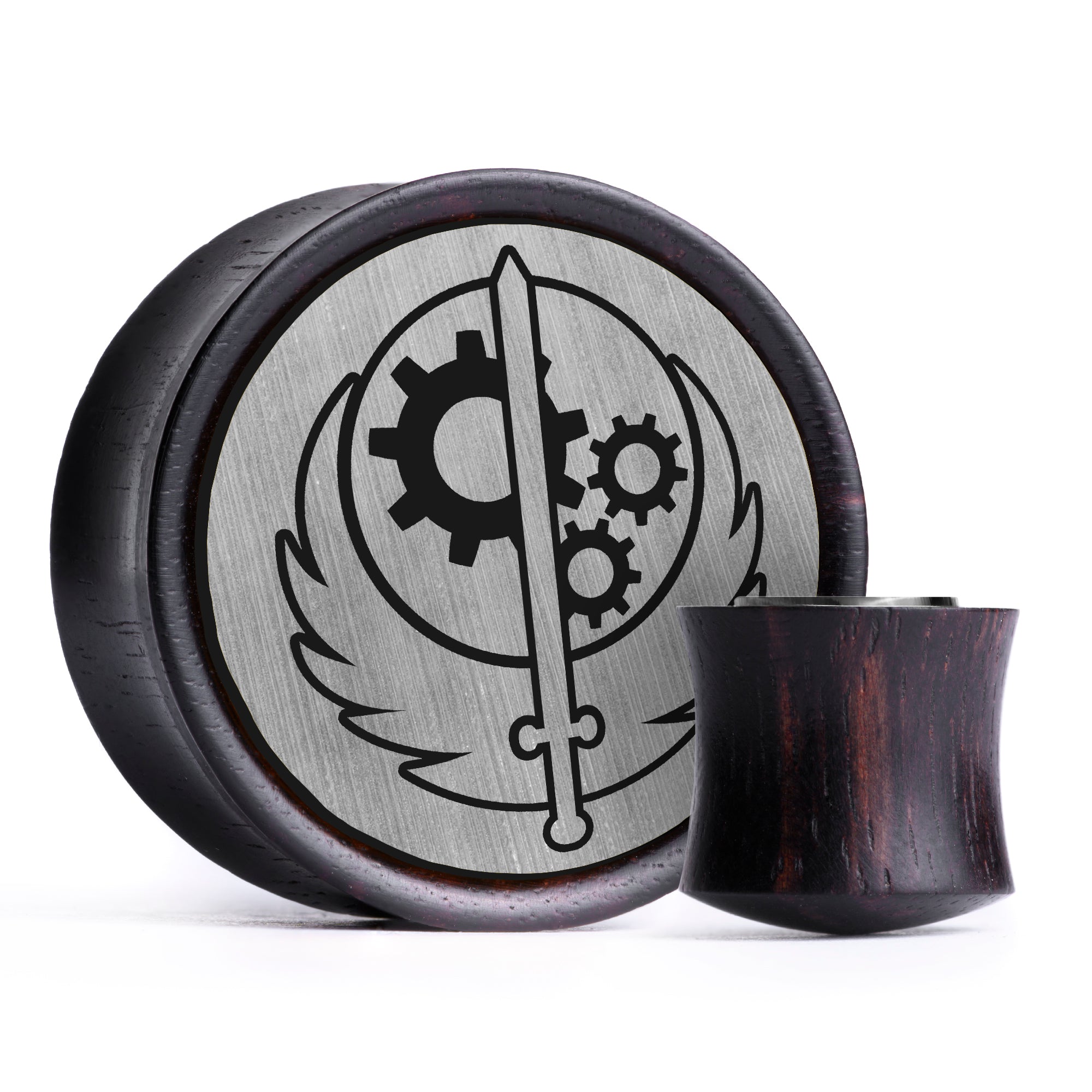 Limitierte Auflage: Doppelt geflanschte Ebenholz-Plugs mit gebürstetem Silber- & schwarzem Inlay aus Holz, versehen mit dem lasergravierten "Brotherhood Of Steel Logo"