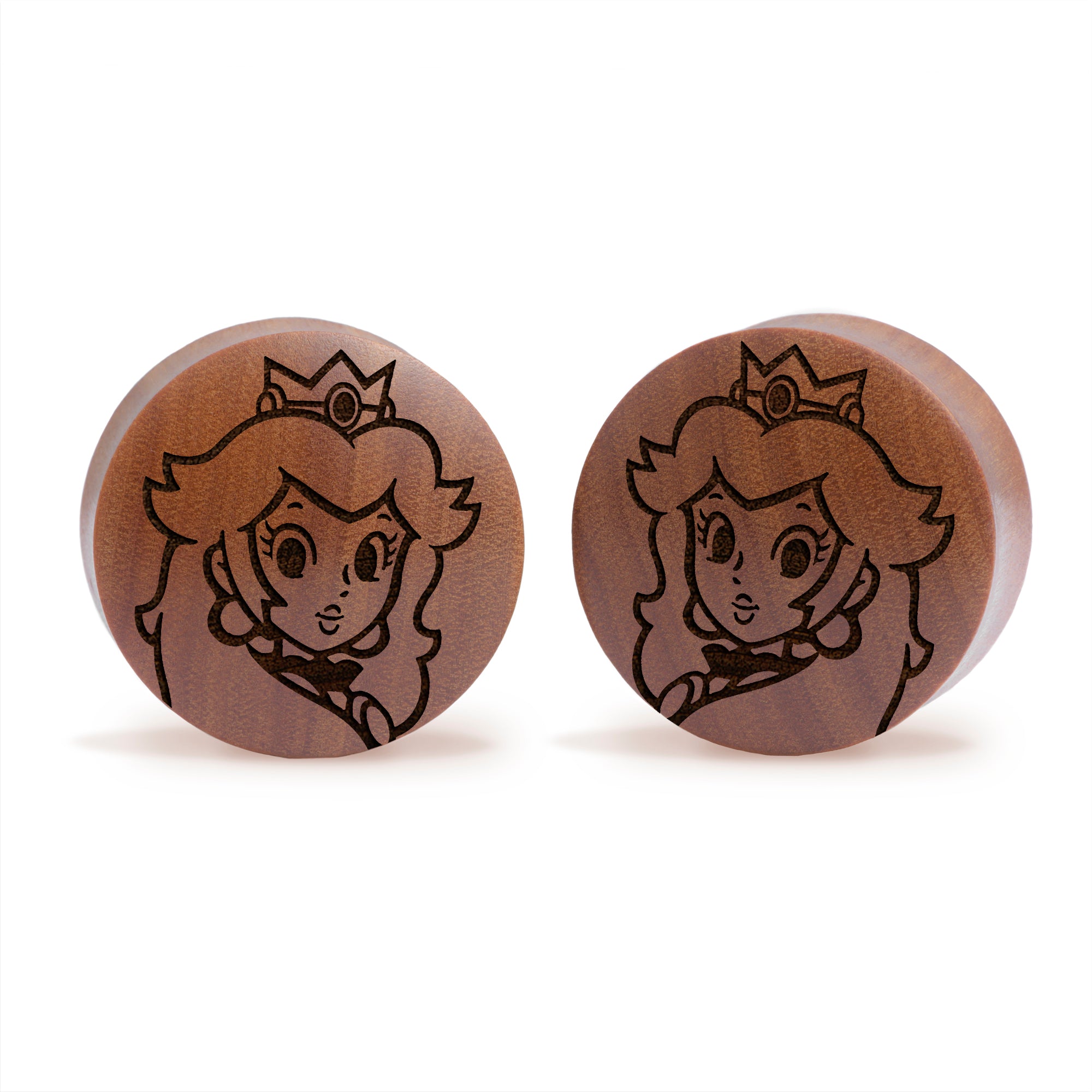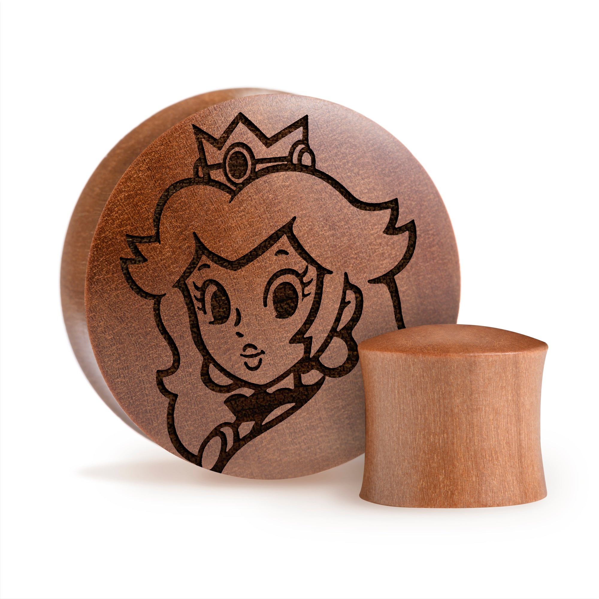 Konvexe Doubleflared Saba Wood Plugs mit unserem lasergravierten „Princess Peach“-Design.