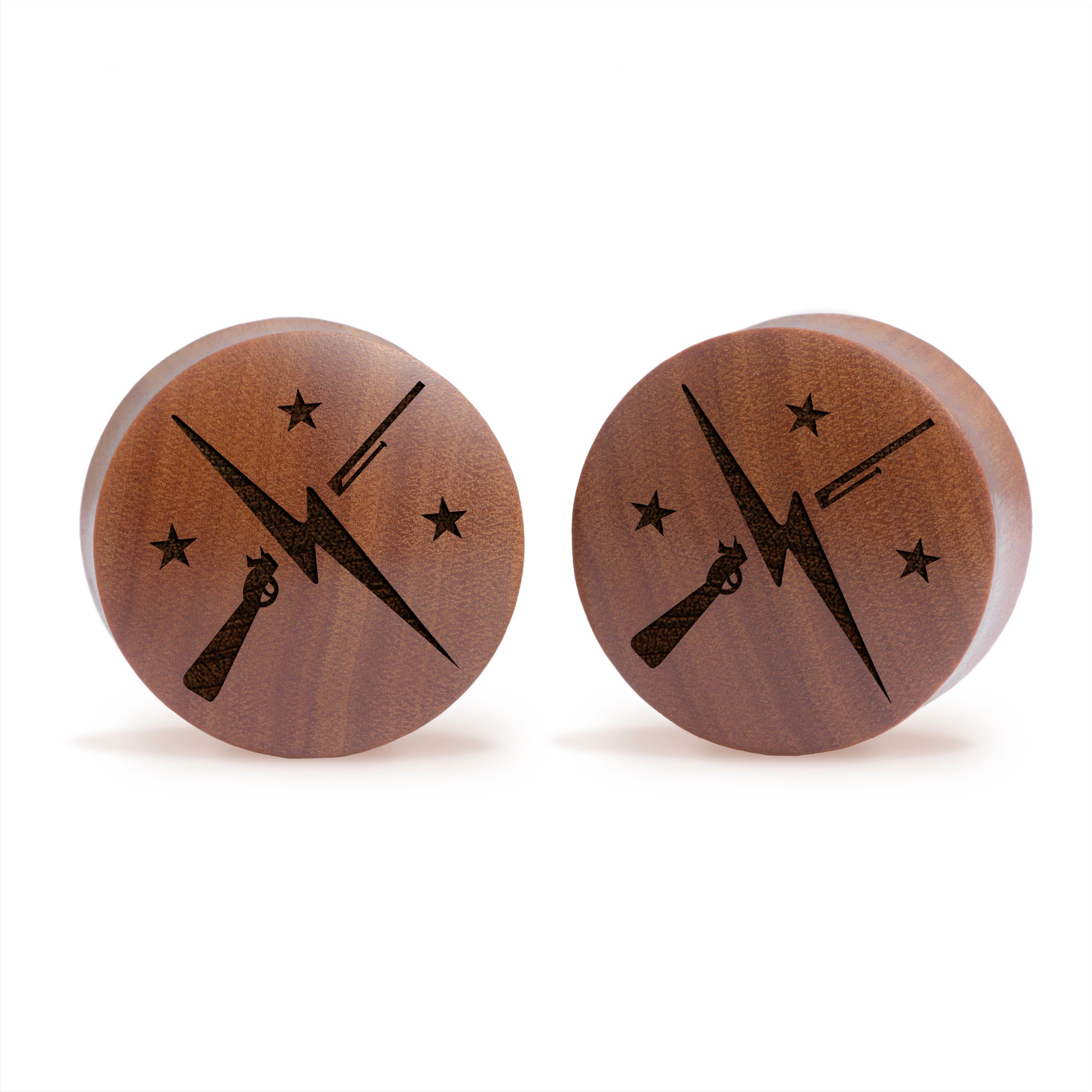 Konvexe Doubleflared Saba Wood Plugs mit unserem lasergravierten „Minutemen Logo“-Design.
