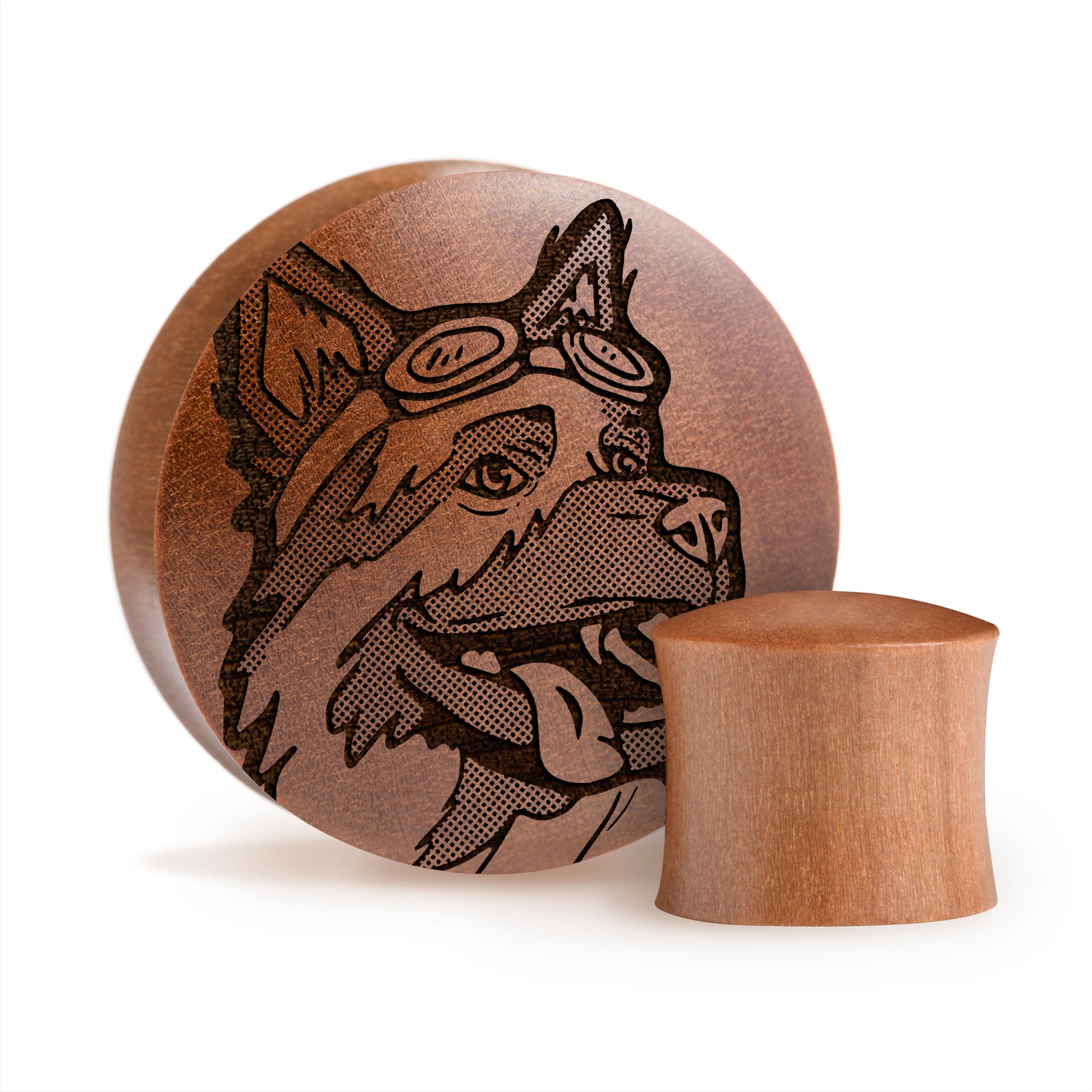 Konvexe Doubleflared Saba Wood Plugs mit unserem lasergravierten „Dogmeat“-Design.