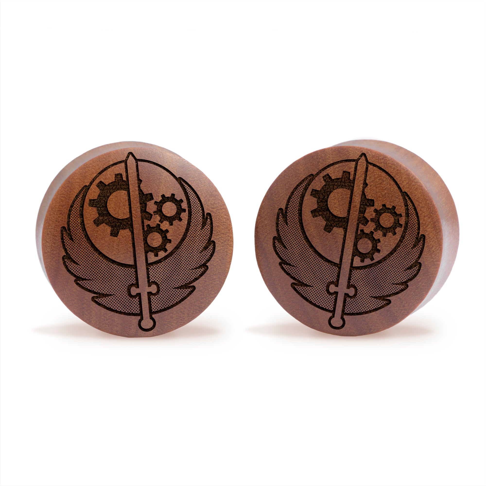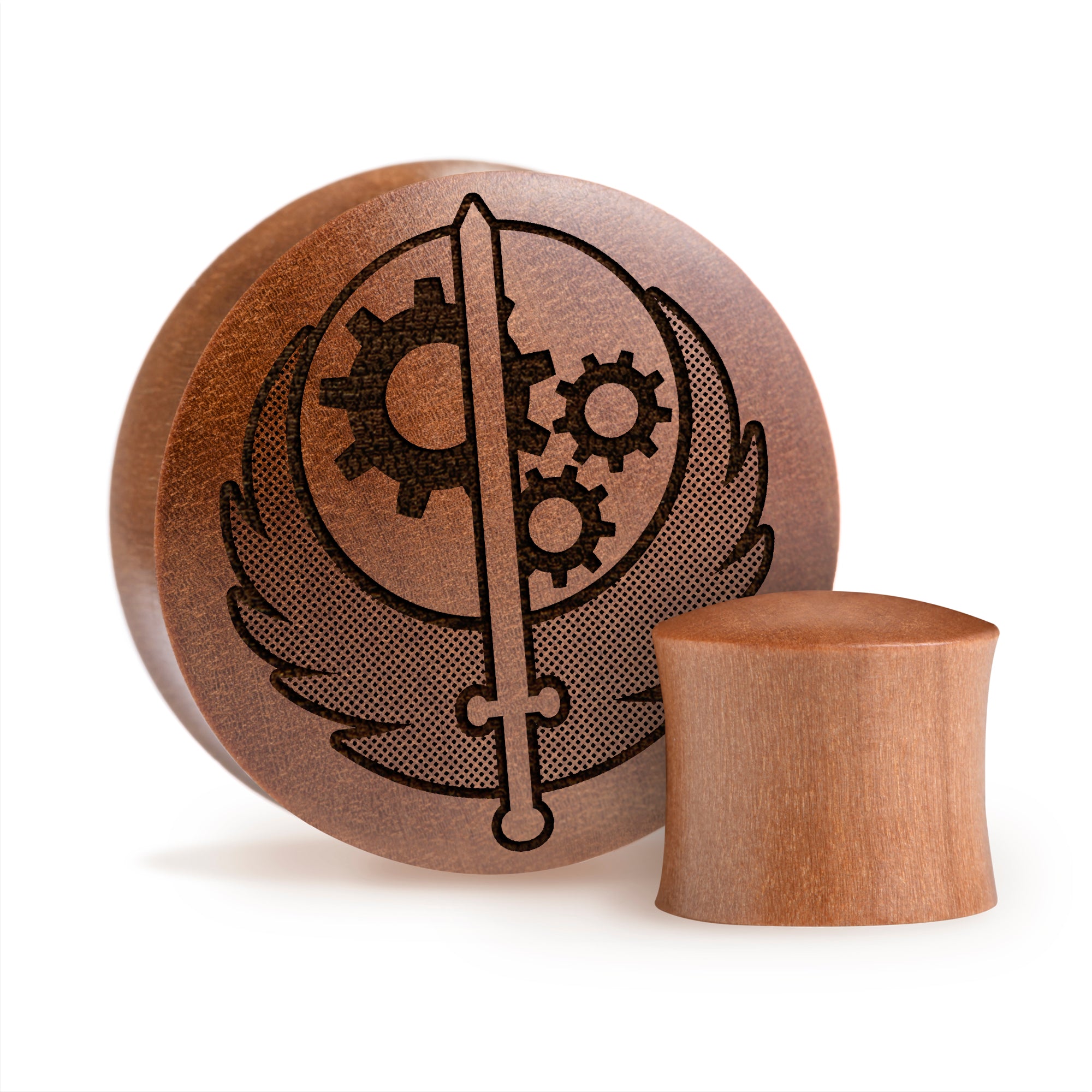 Konvexe Doubleflared Saba Wood Plugs mit unserem lasergravierten „Brotherhood Of Steel Logo“-Design.