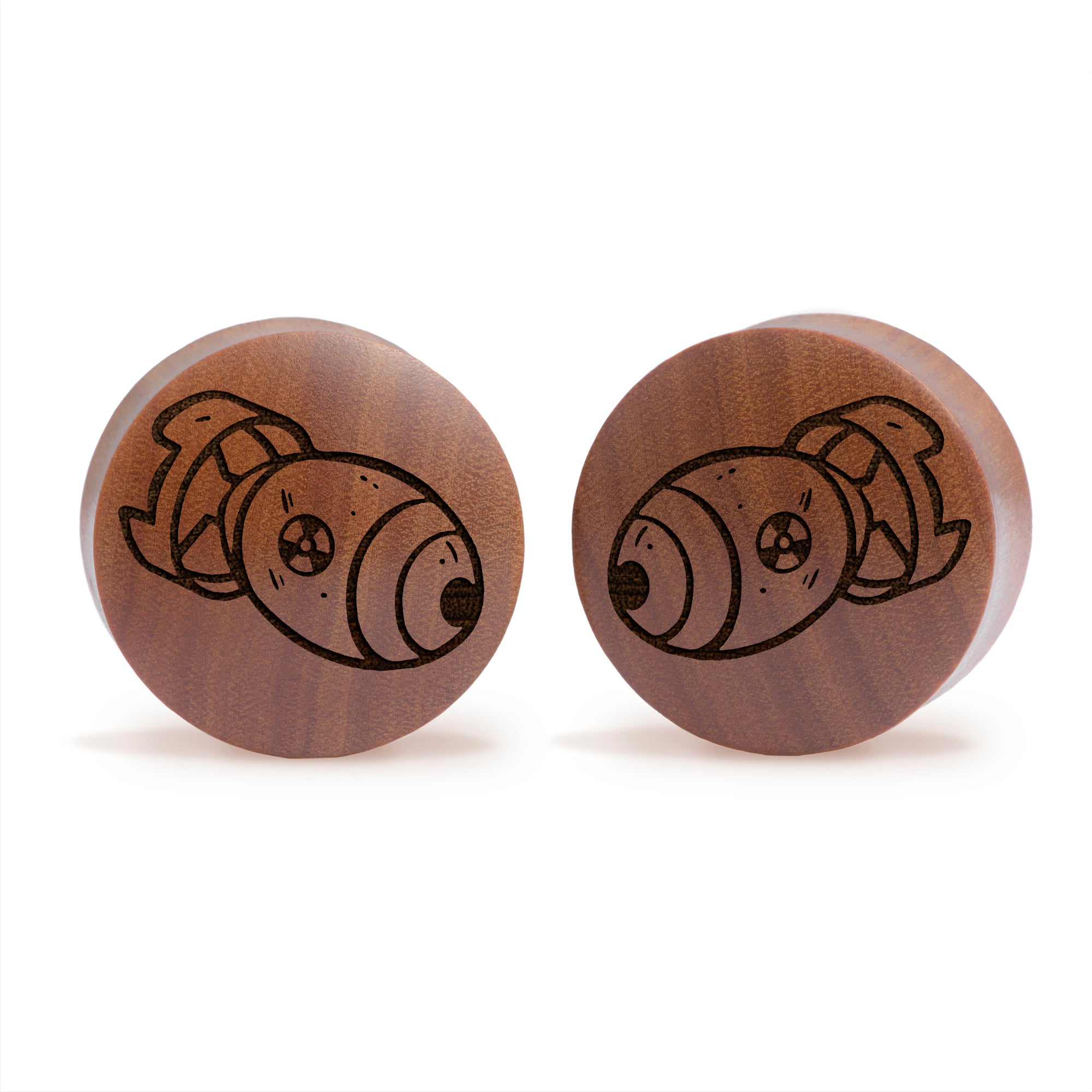 Konvexe Doubleflared Saba Wood Plugs mit unserem lasergravierten „Mini Nuke“-Design.