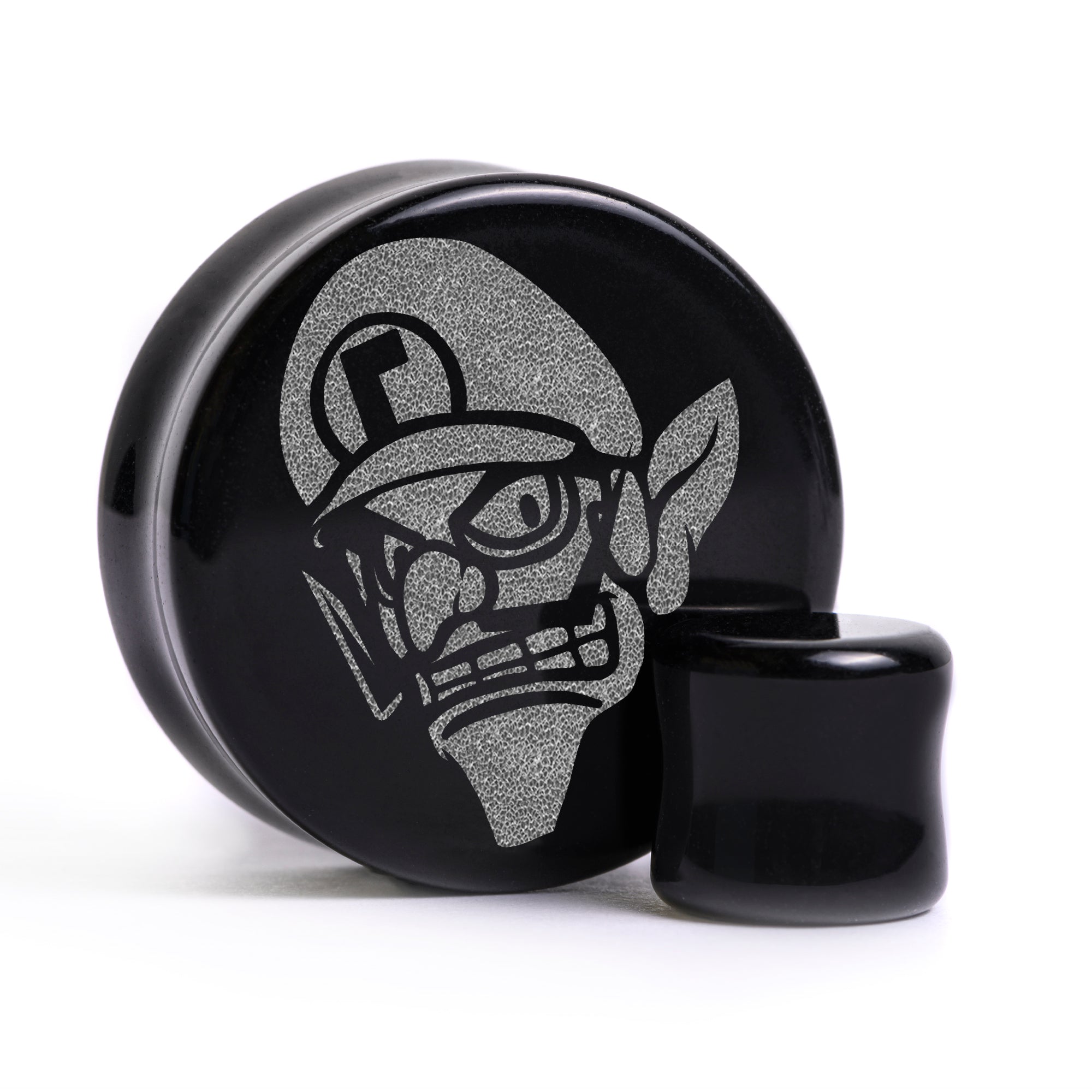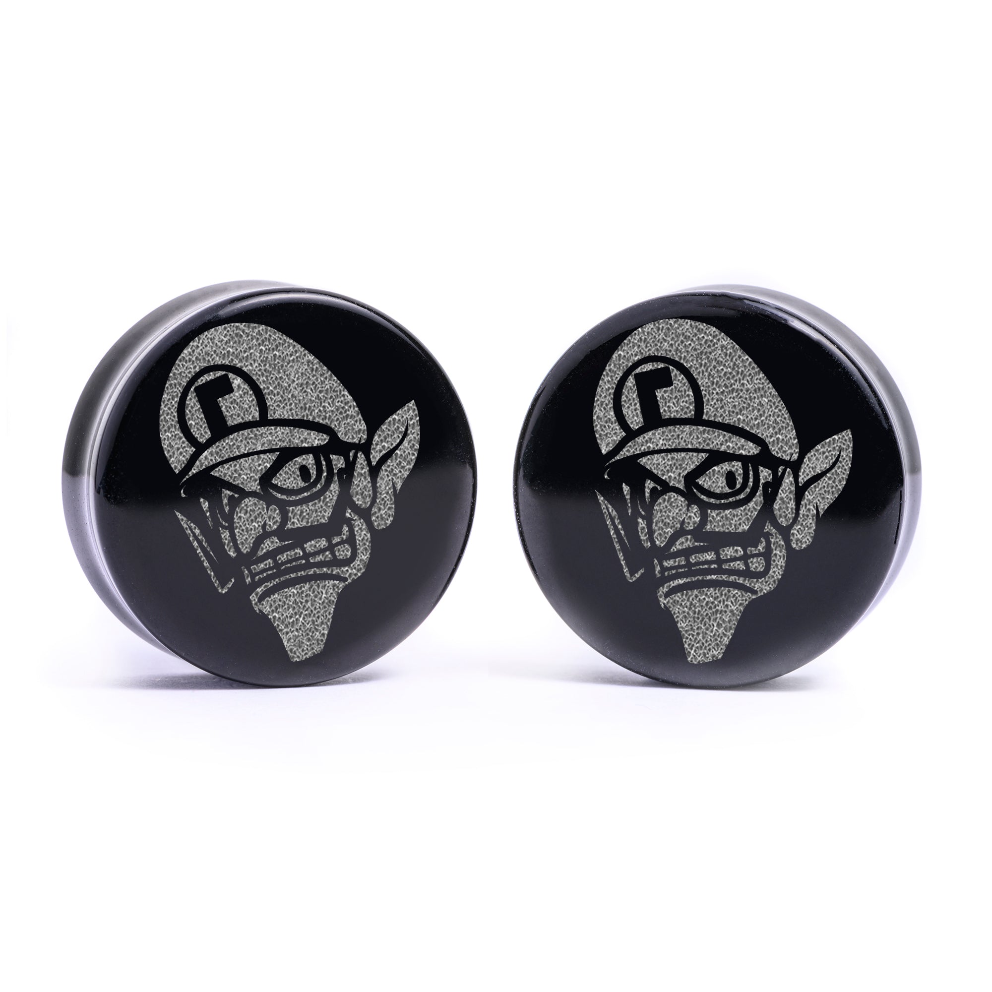 Flachfrontige Doubleflared Black Glass Plugs mit lasergraviertem "Waluigi"-Design.