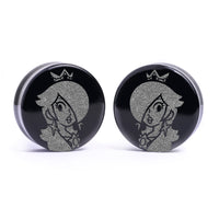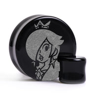 Flachfrontige doppelt geflanschte schwarze Glas Plugs mit lasergraviertem "Rosalina"-Design.