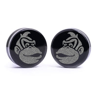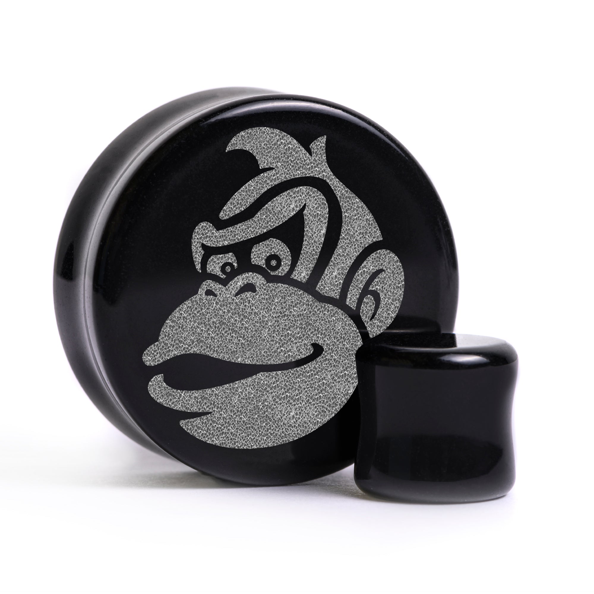 Flachfrontige Doubleflared Black Glass Plugs mit lasergraviertem "Donkey Kong"-Design.
