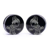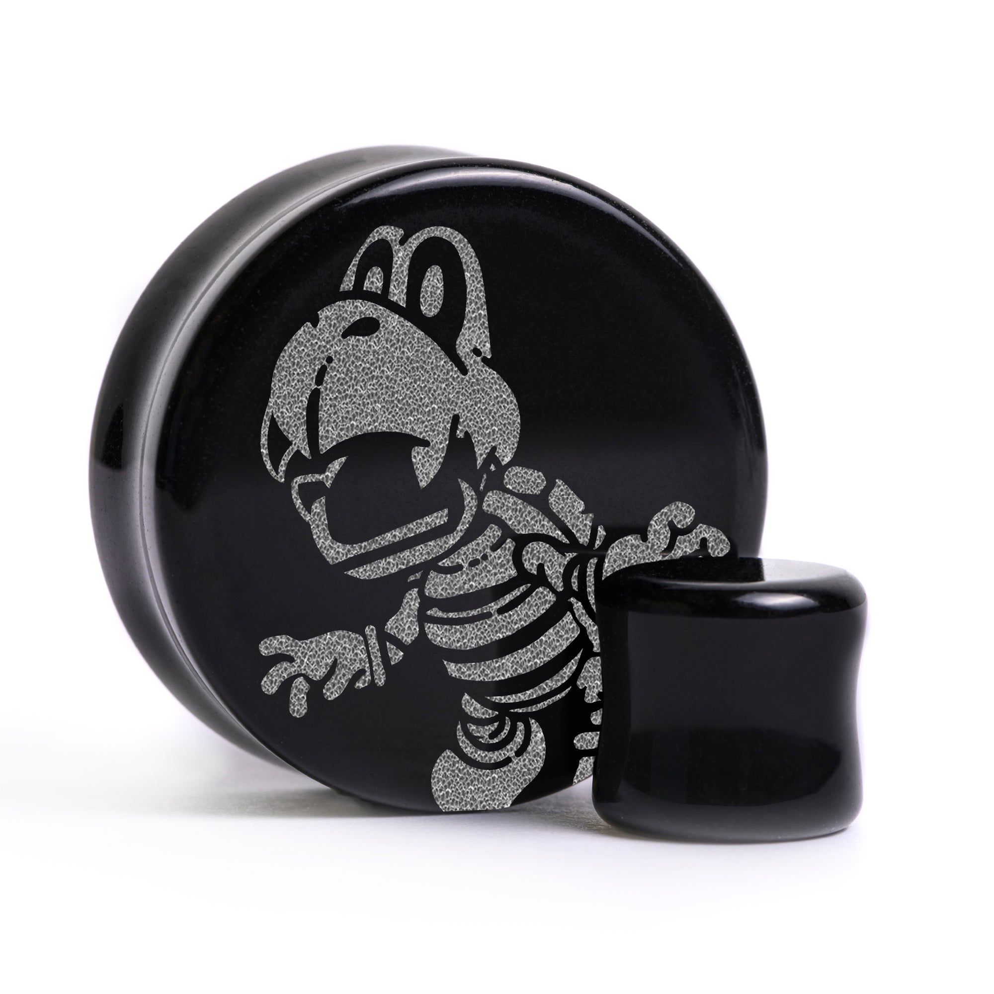 Flachfrontige Doubleflared Black Glass Plugs mit lasergraviertem "Dry Bones"-Design.