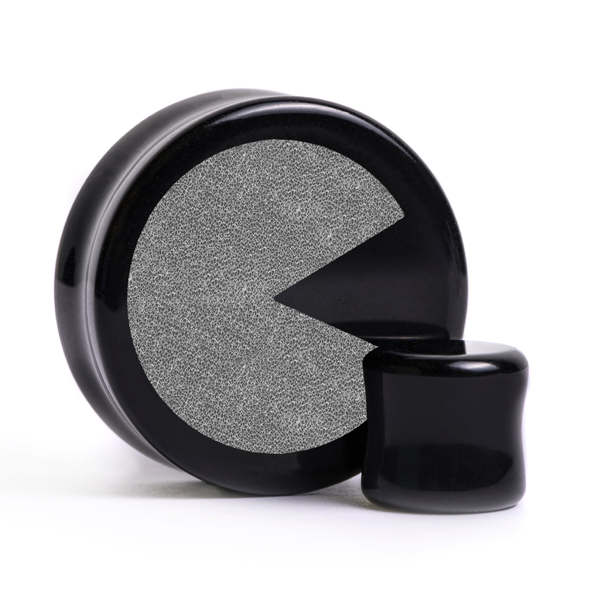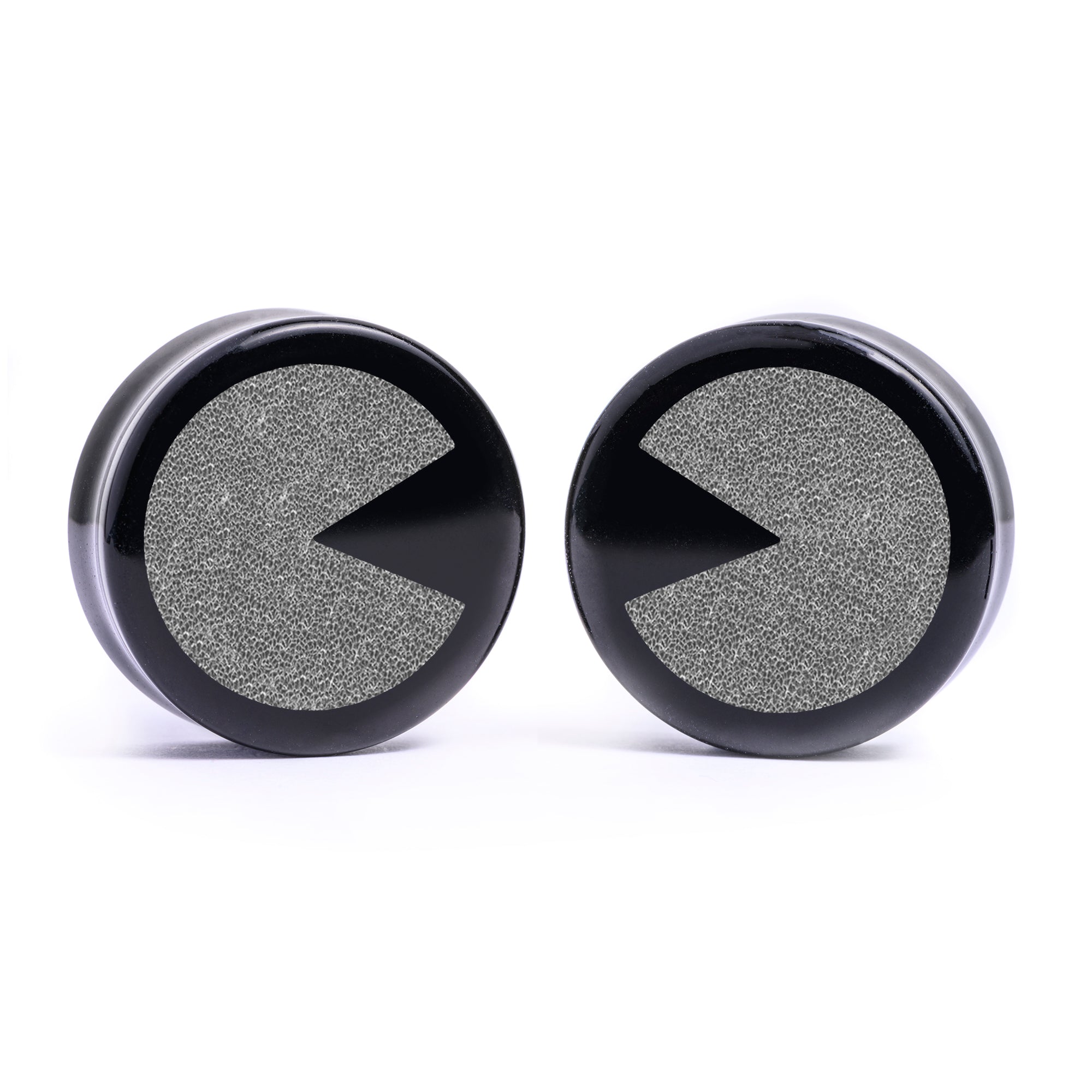 Flachfrontige Doubleflared schwarze Glas-Plugs mit lasergraviertem "Pac-Man"-Design.