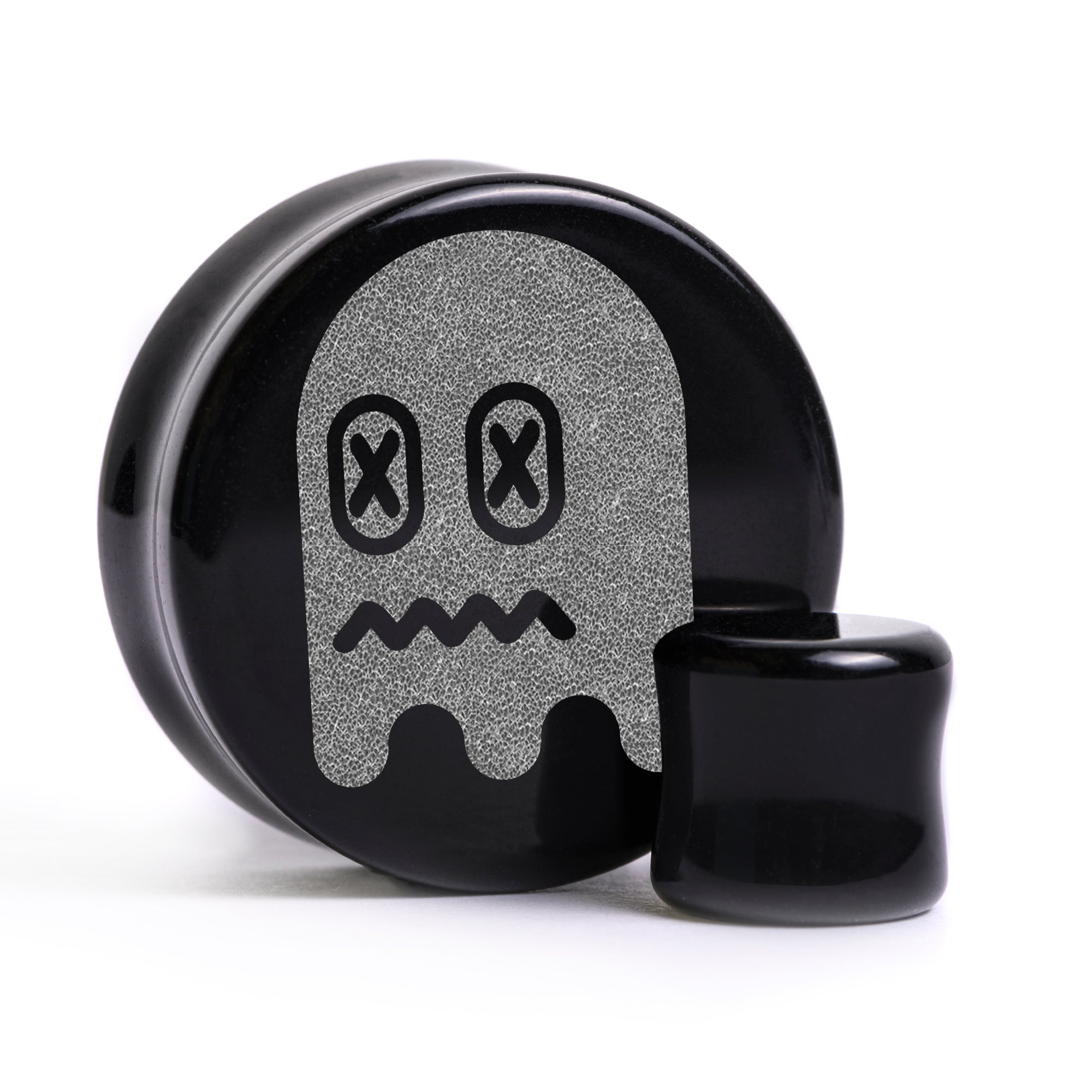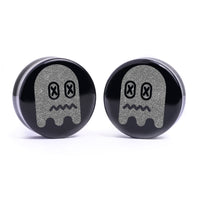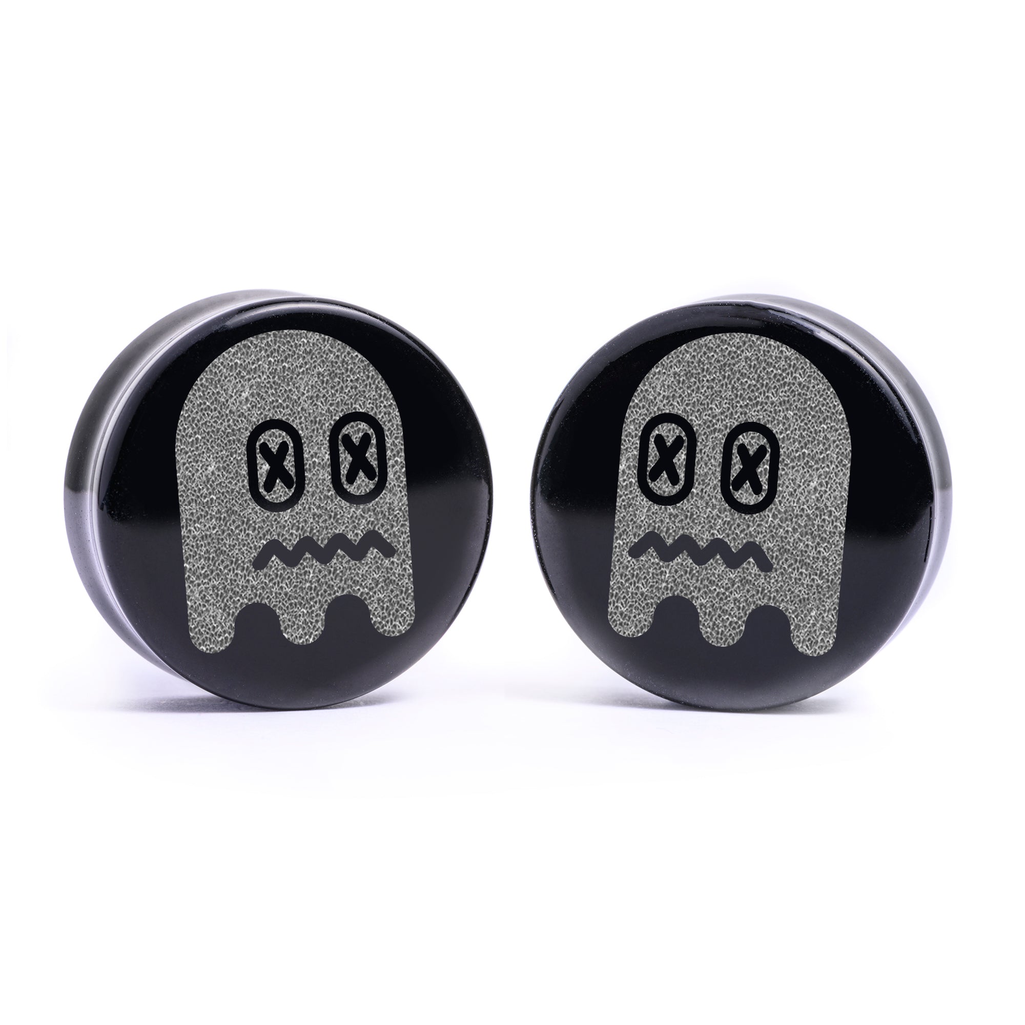 Flachfrontige Doubleflared Black Glass Plugs mit lasergraviertem "Pac-Man Scared Ghost"-Design.