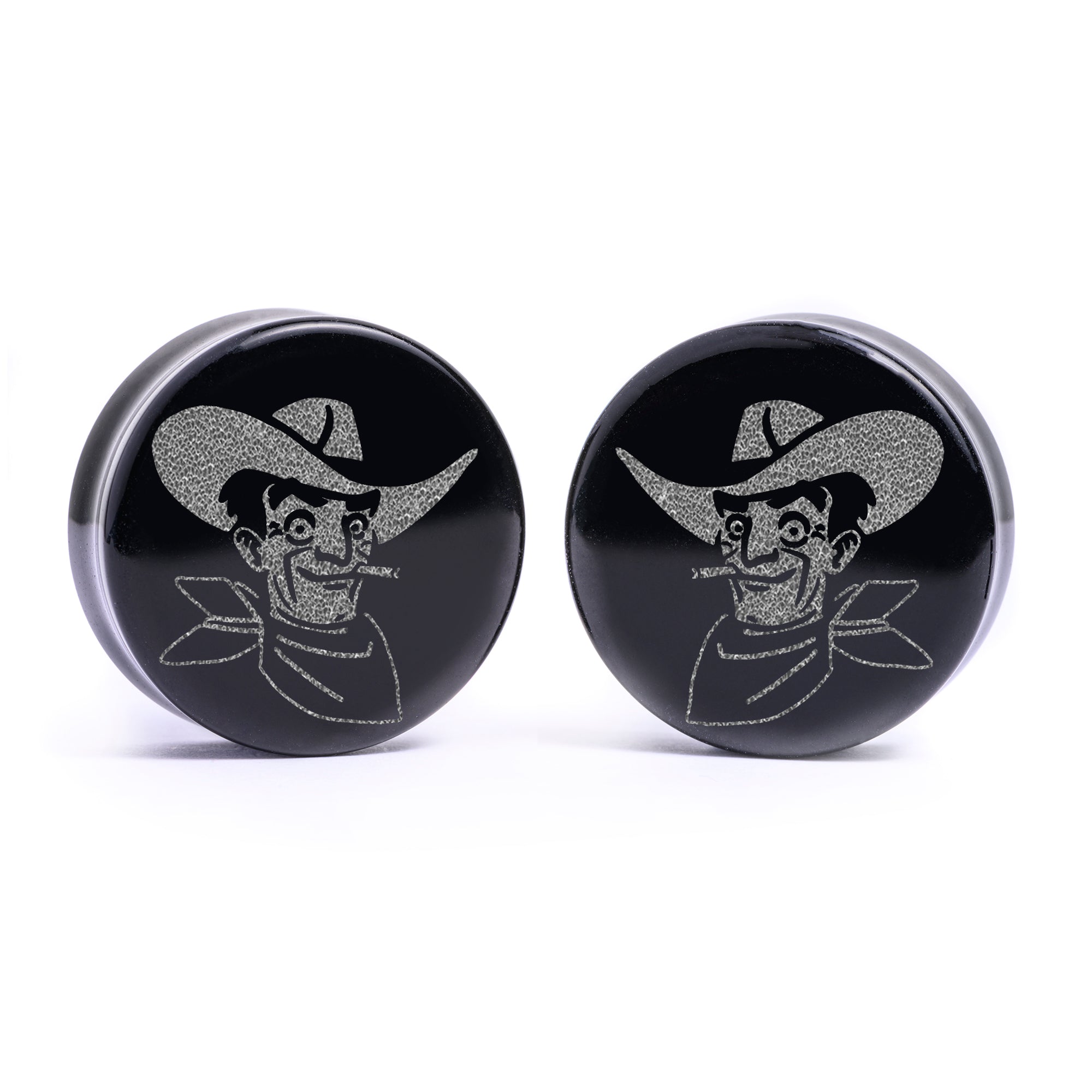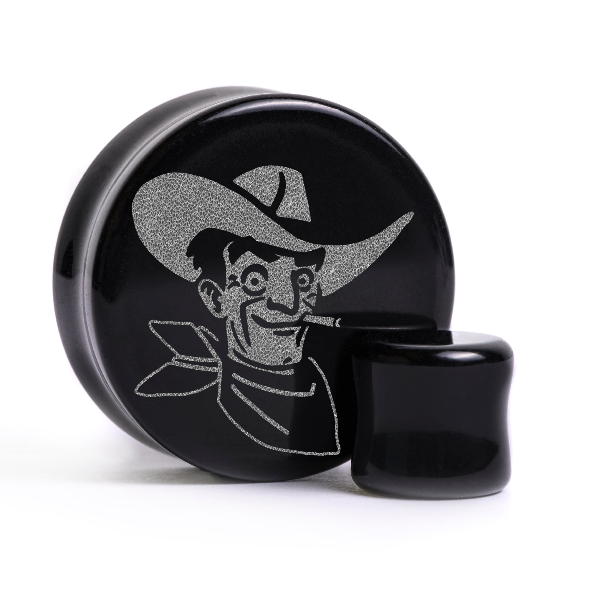 Flachfrontige Doubleflared Black Glass Plugs mit lasergraviertem "Victor"-Design.