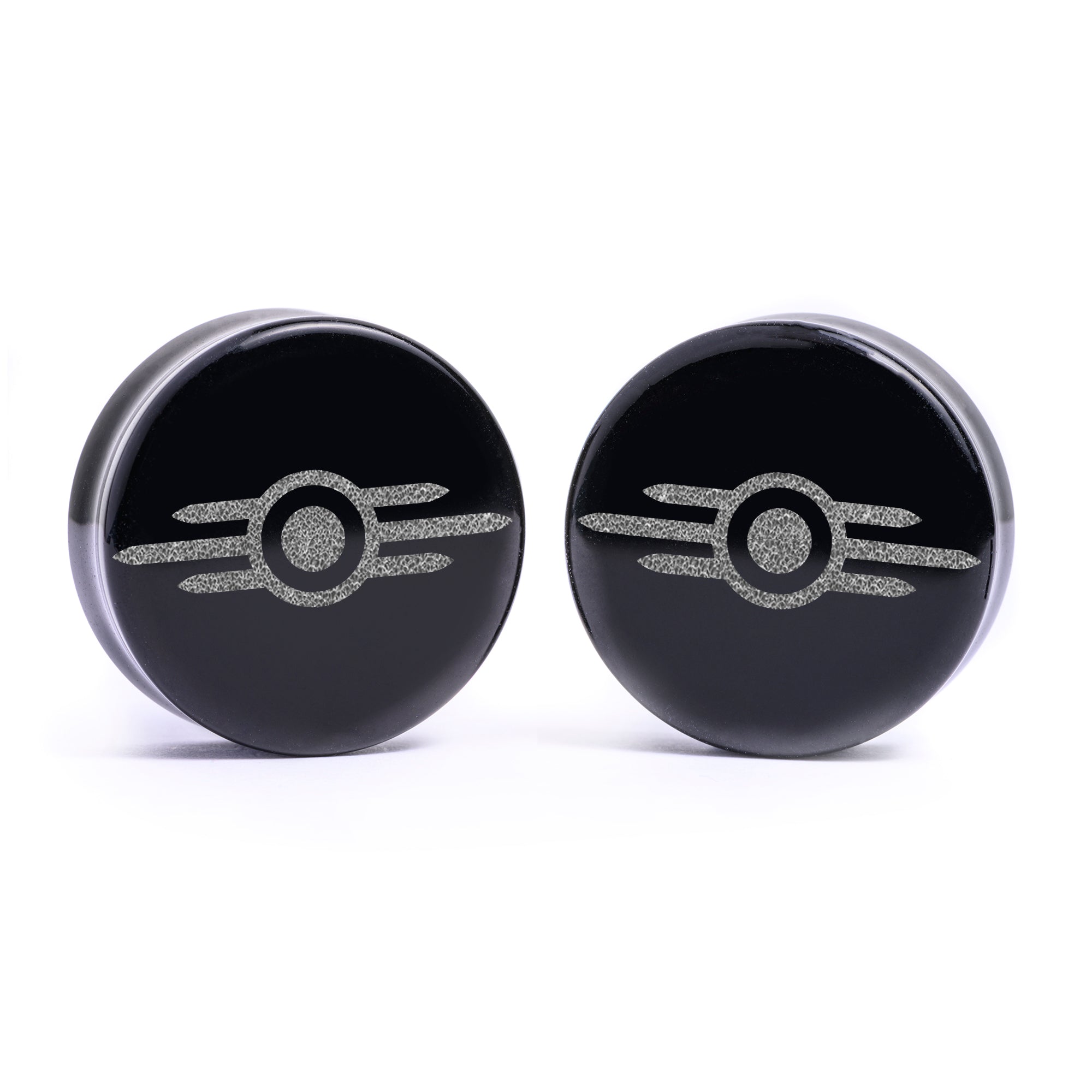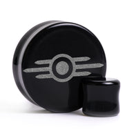 Flachfrontige Doubleflared schwarze Glas-Plugs mit lasergraviertem "Vault-Tec Logo"-Design.