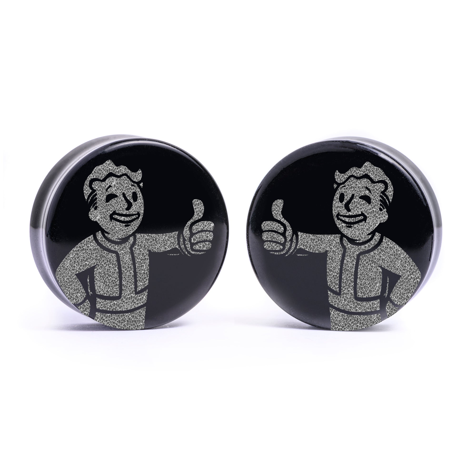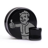 Flachfrontige Doubleflared schwarze Glas-Plugs mit lasergraviertem "Vault Boy"-Design.