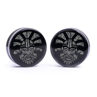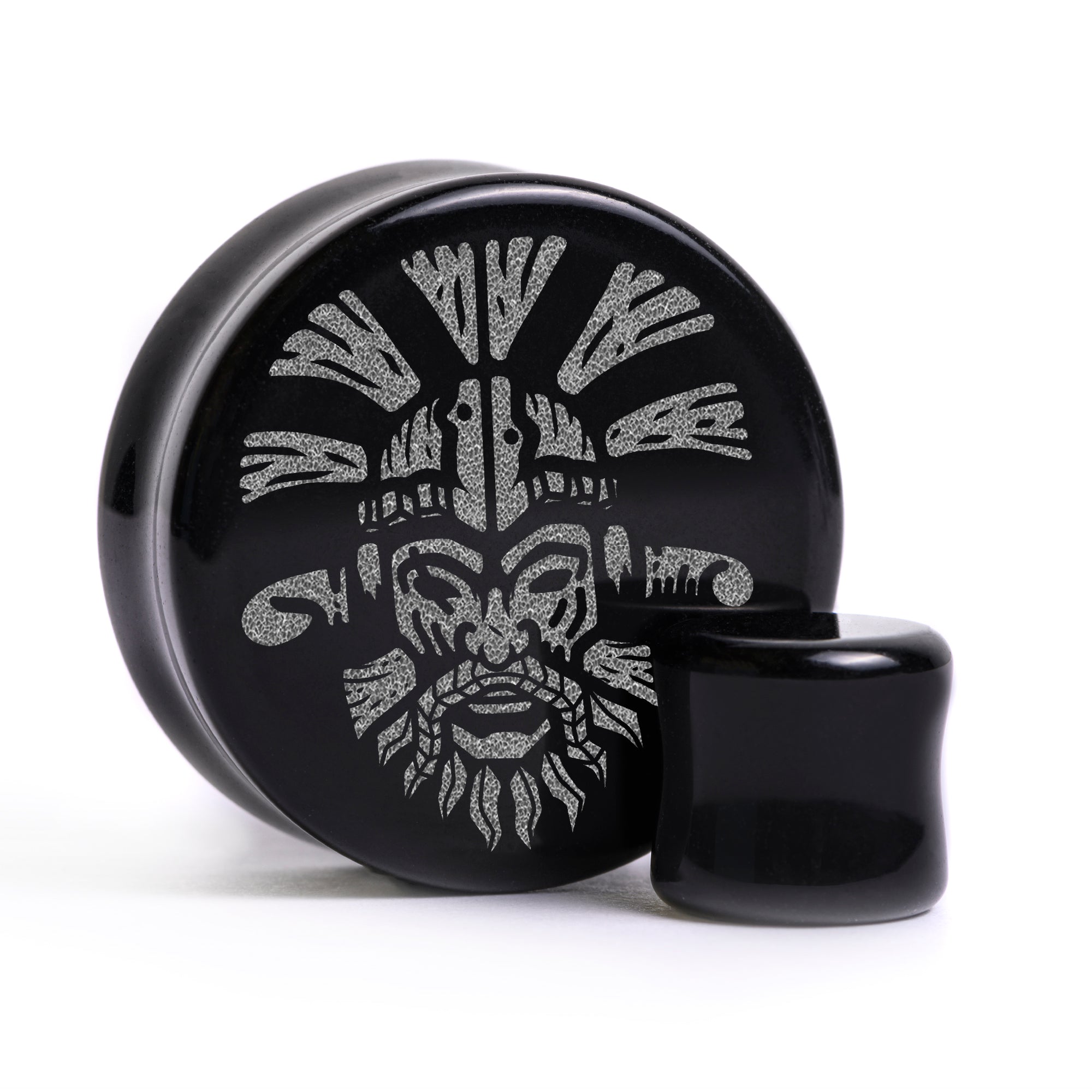 Flachfrontige doppelt geflanschte schwarze Glas-Plugs mit lasergraviertem "Legate Lanius"-Design.