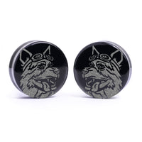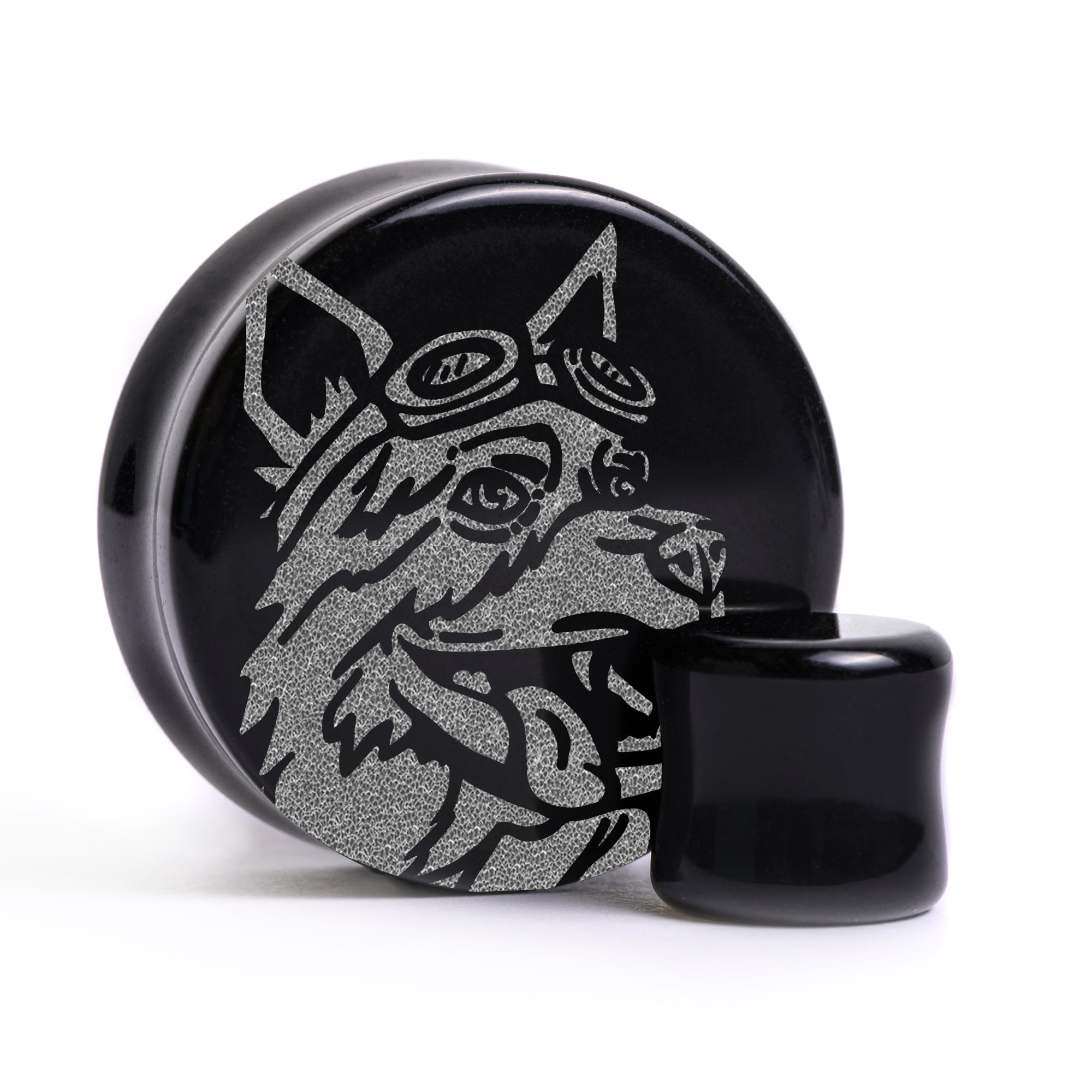 Flachfrontige Doubleflared Black Glass Plugs mit lasergraviertem "Dogmeat"-Design.