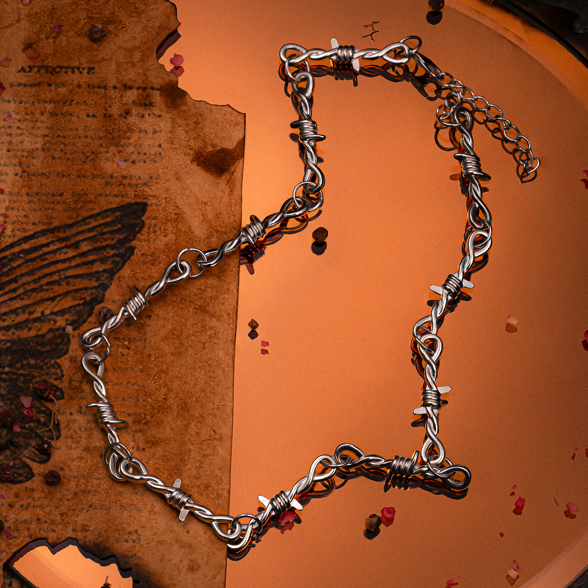 Diese silberne Stacheldraht-Halskette ist eine tolle Ergänzung für jedes Outfit. Kreieren Sie diesen herausragenden Look. Diese Halskette besteht aus ineinandergreifenden, gedrehten Stacheldrahtabschnitten.