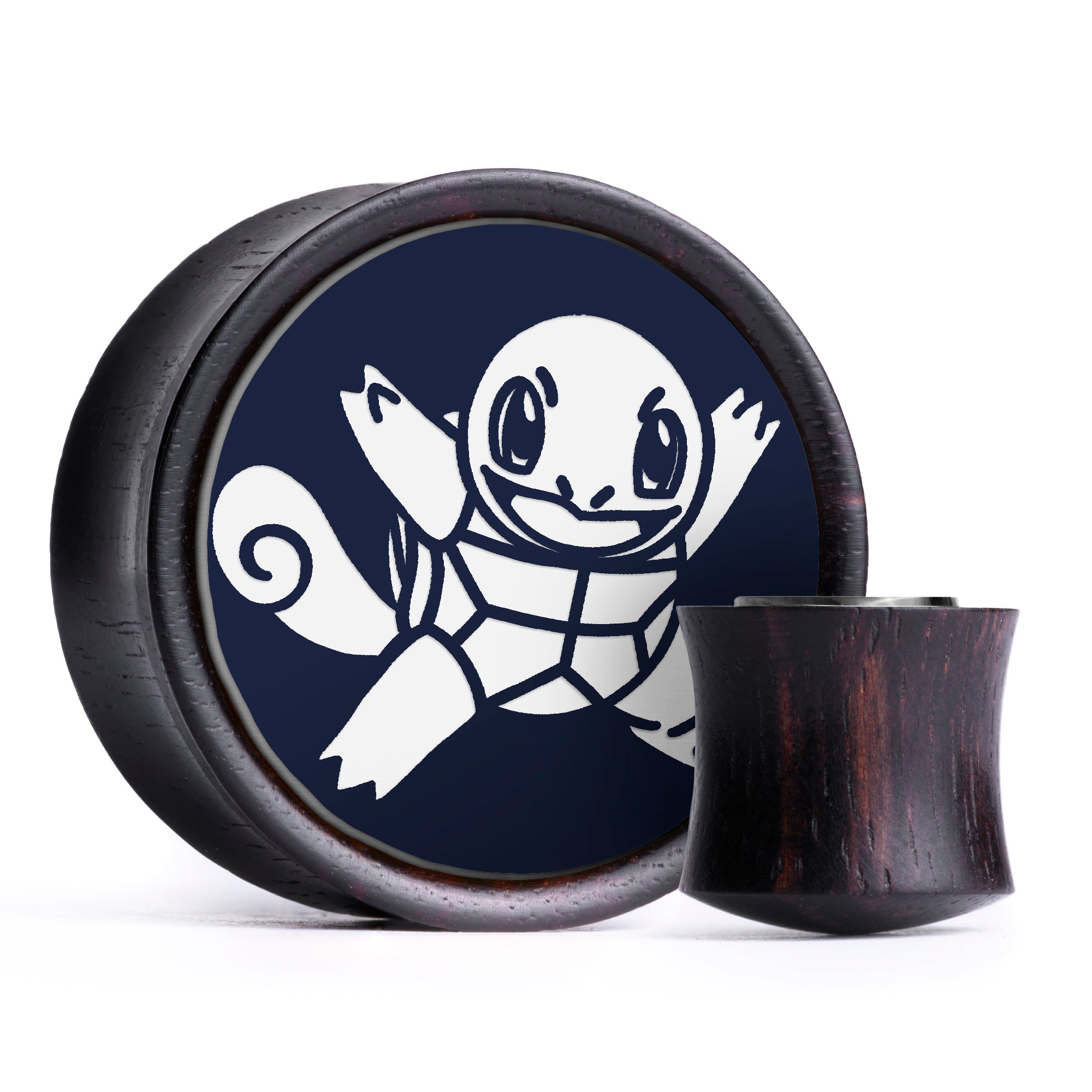 Doppelt ausgestellte Plugs aus Ebenholz mit blauem und weißem Inlay in limitierter Auflage mit Lasergravur Pokémon „Eichhörnchen“