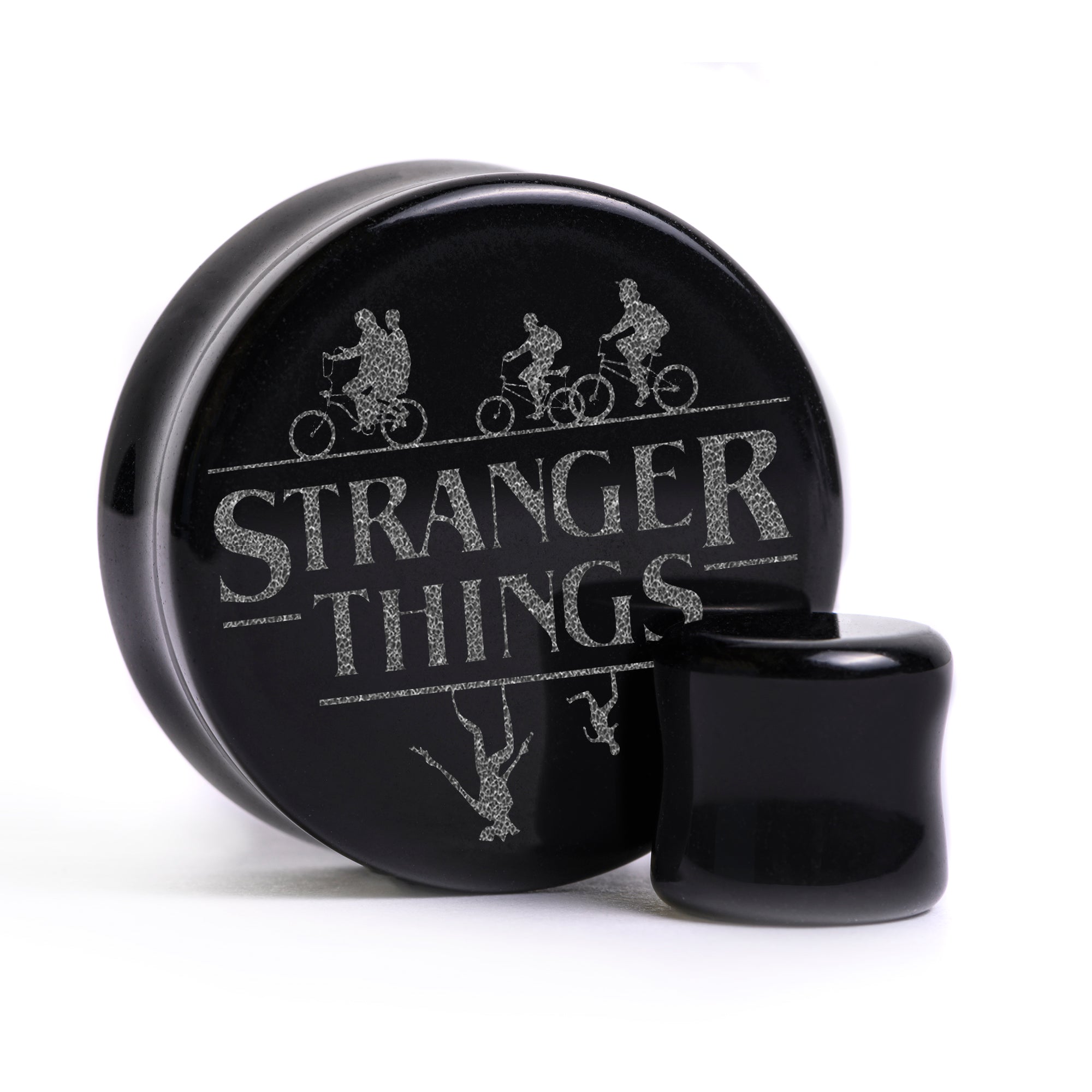 Flach Gesichter Doubleflared Schwarze Glas Plugs mit unserem lasergravierten „Stranger Things Logo'' Design.