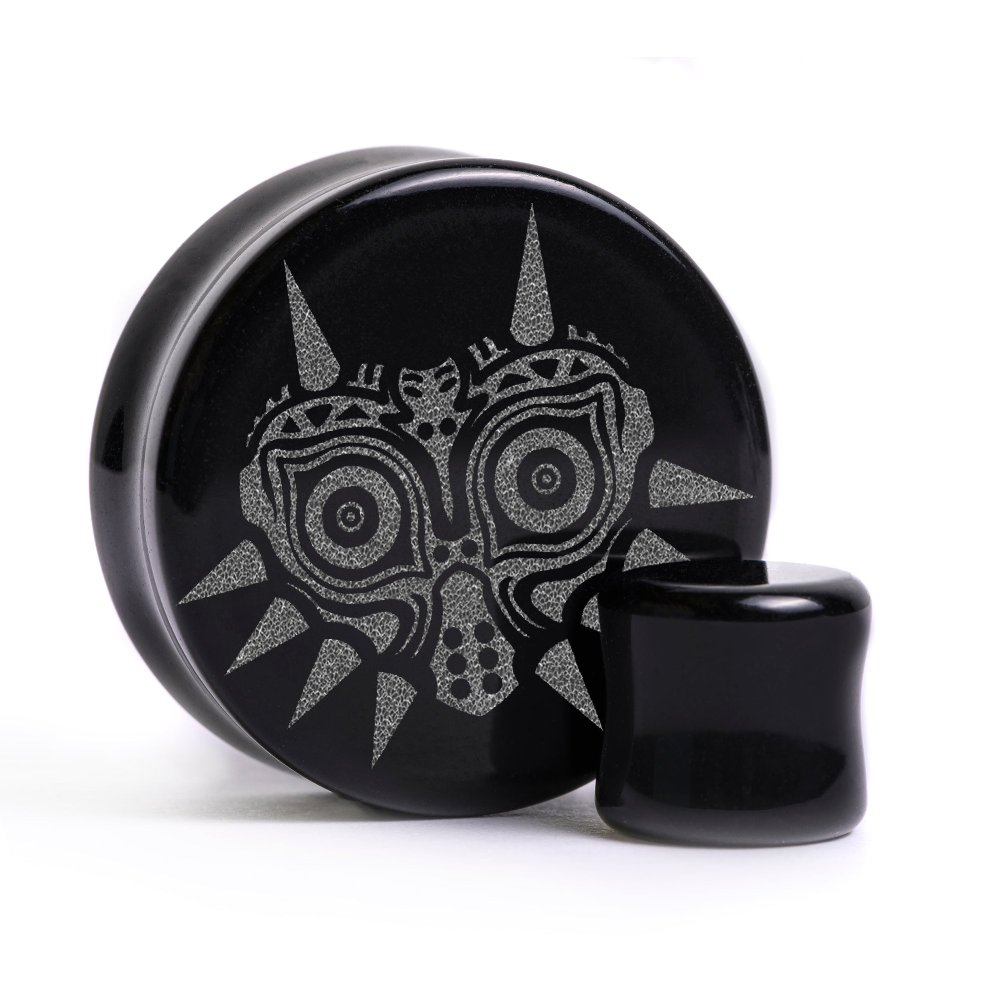 Flach Gesichter Doubleflared Schwarze Glas Plugs mit unserem limitierten Lasergravur-Design „MAJORAS MASK".