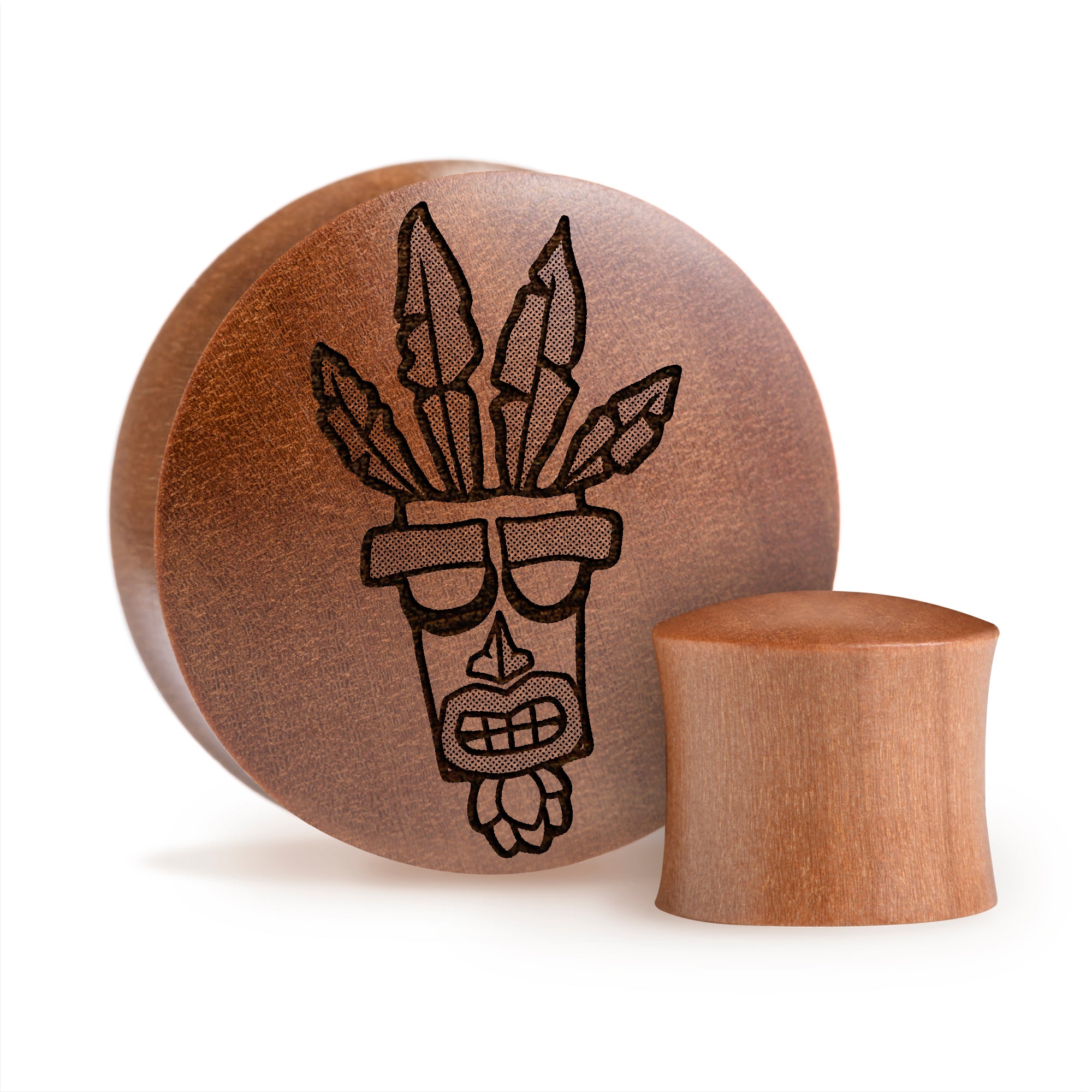 Convex Doubleflared Saba Wood Plugs featuring our laser engraved “Aku Aku" design.