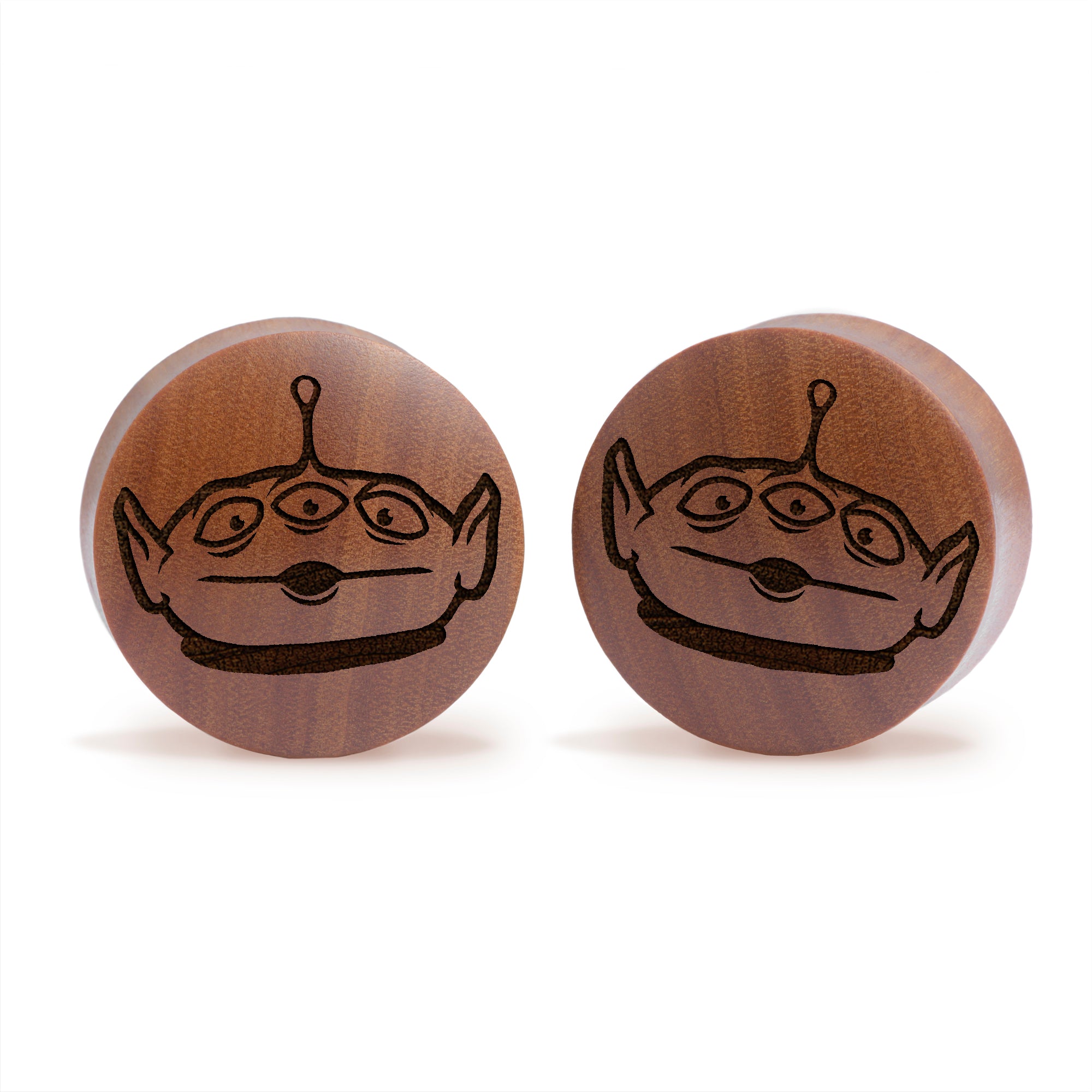 Convex Doubleflared Saba Wood Plugs featuring our laser engraved “Alien - Toy Story" design.