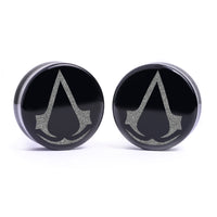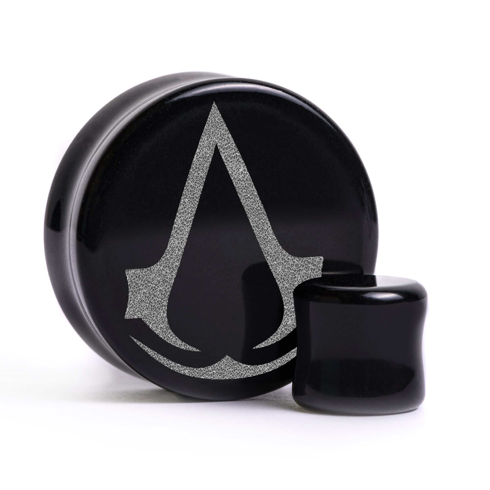 Flat Faced Doubleflared Black Glass Plugs featuring laser engraved “Assassins Creed Logo'' design.