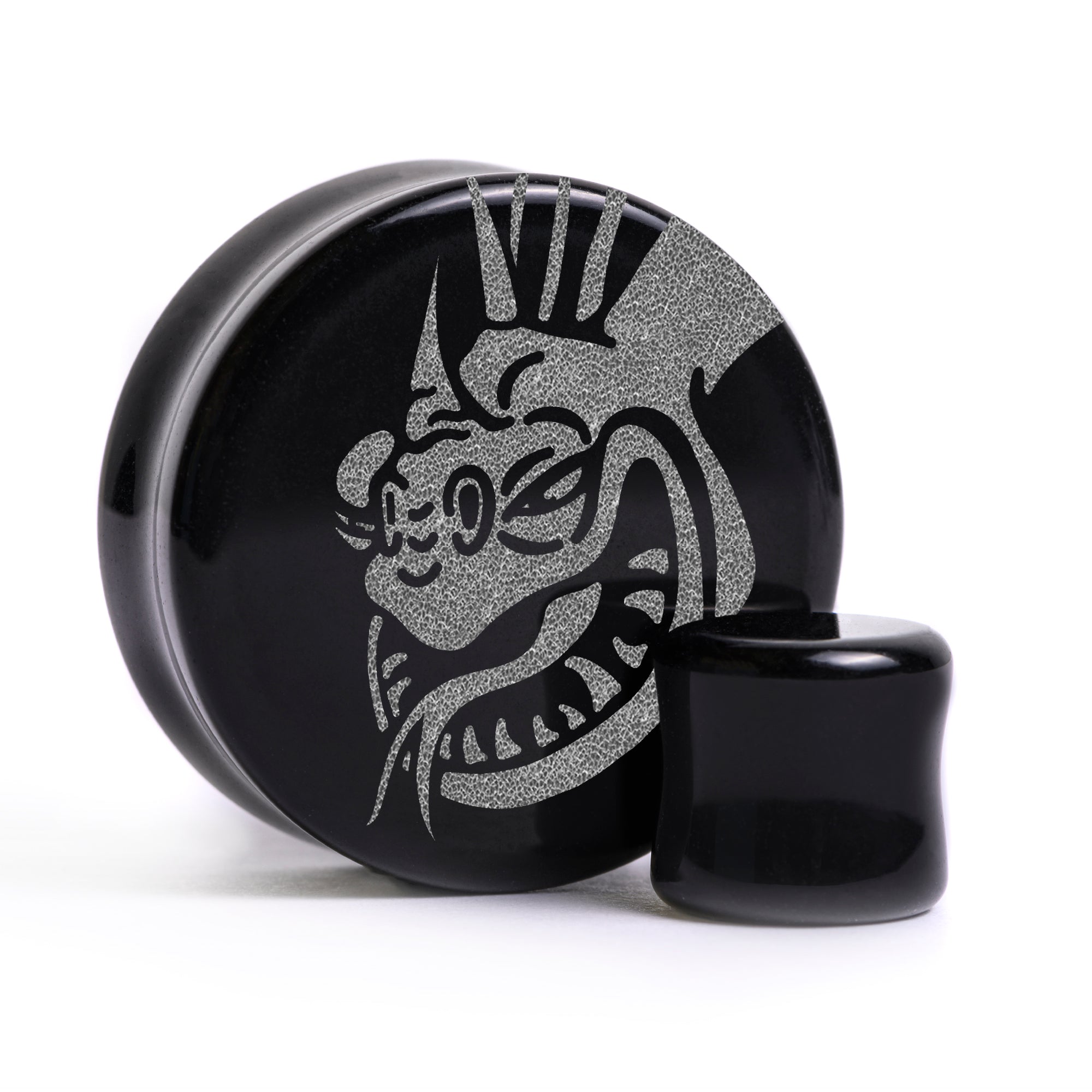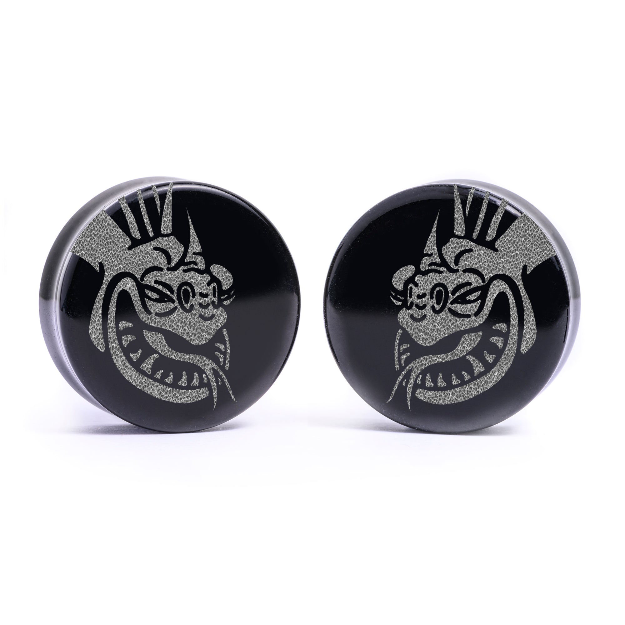 Flat Faced Doubleflared Black Glass Plugs featuring laser engraved “Barf & Belch"  How to Train your Dragon plugs have a flat front and flat back.‚ Glass plugs are known for being smooth, durable and easy to insert.‚ Glass is an inert material which makes them great for people with sensitive ears as they are very unlikely to cause reactions.