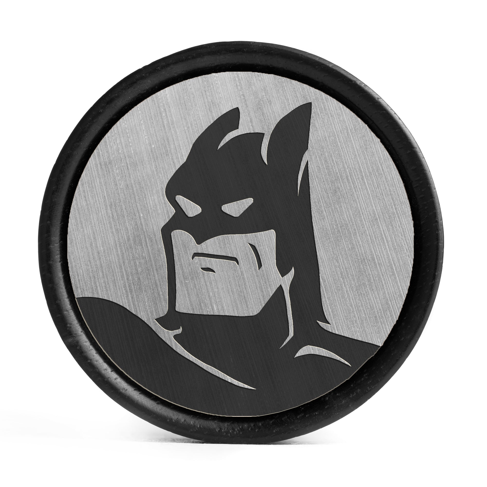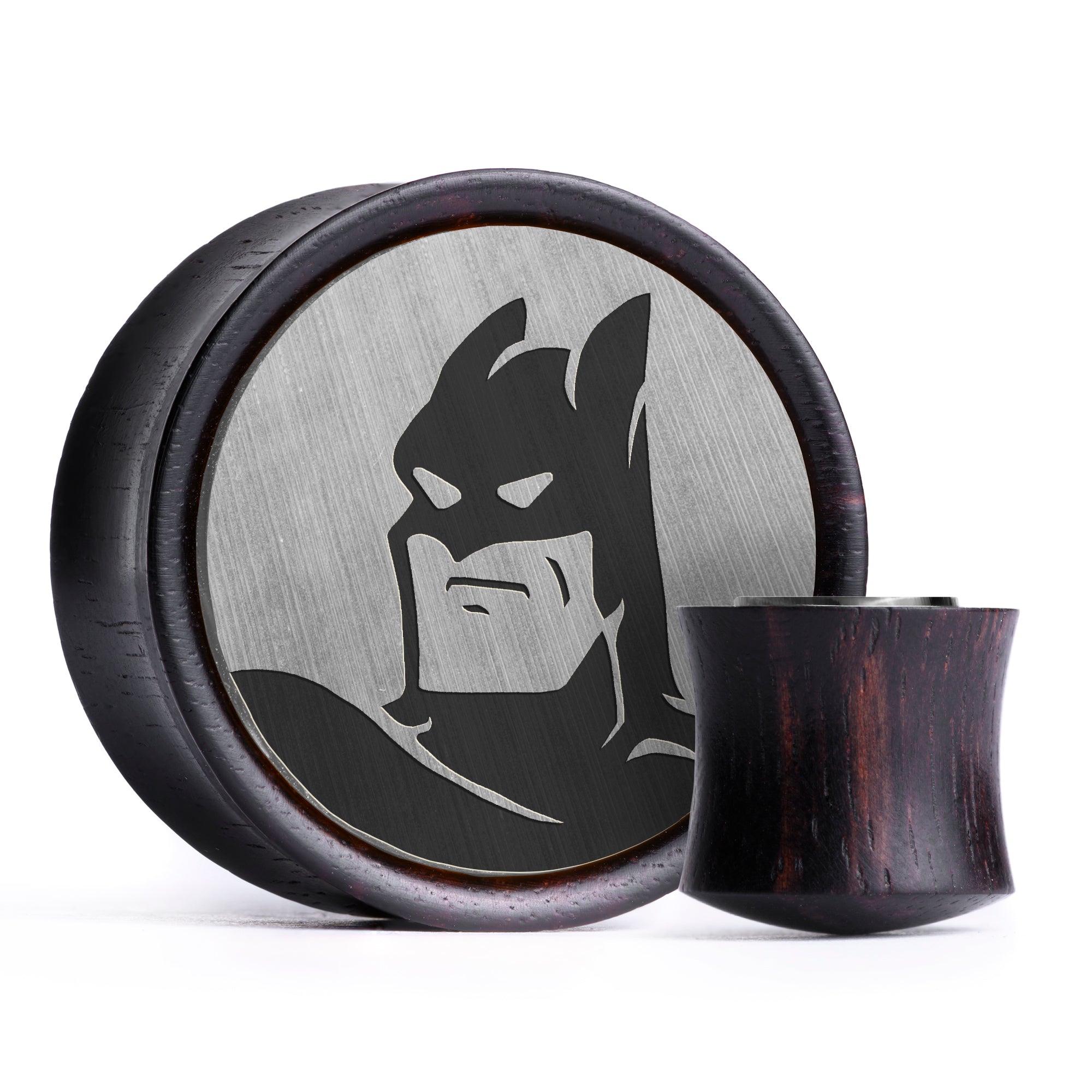 Limited Edition Double flared Ebony Brushed Silver & Black Inlay Wood Plugs featuring the laser engraved "Batman 92"