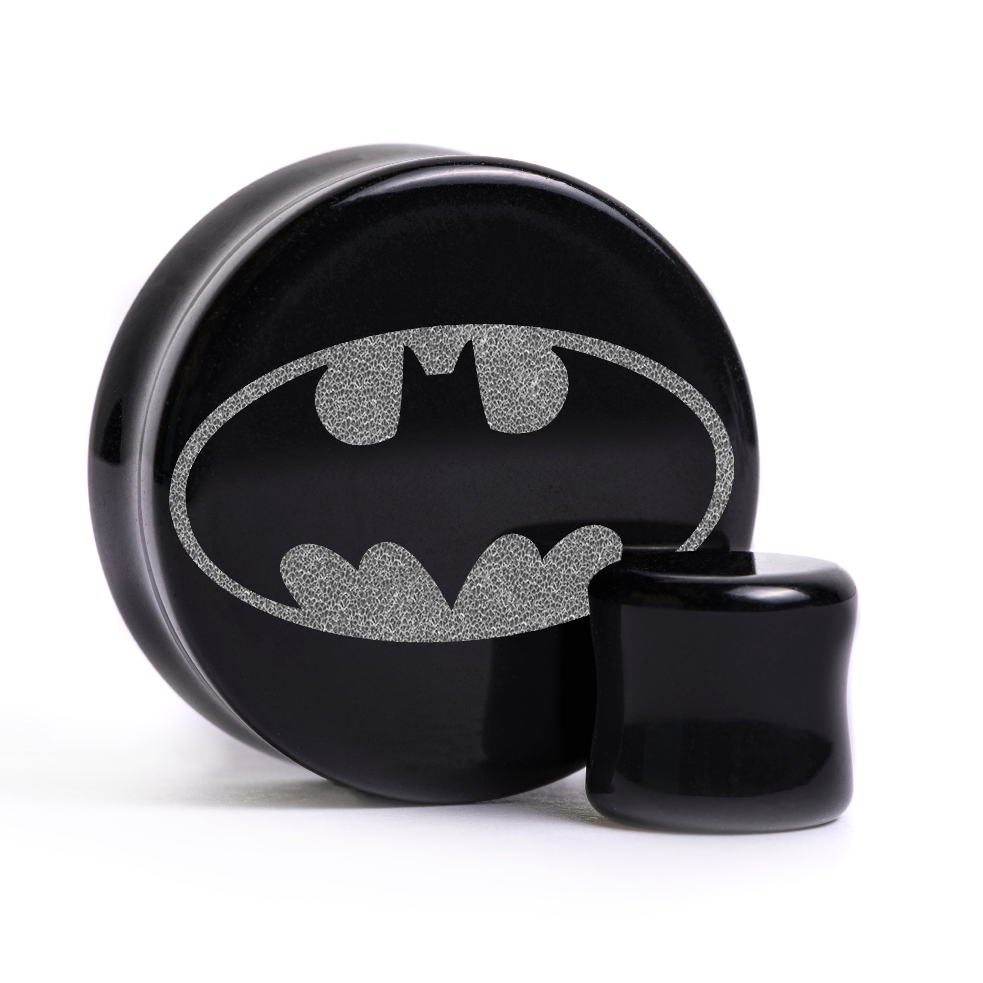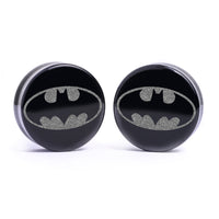 Flat Faced Doubleflared Black Glass Plugs featuring laser engraved “Batman Logo'' design.