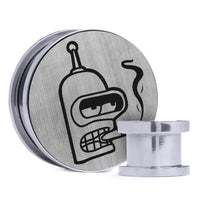 Limited Edition, High Quality Silver Steel Double flare Screw Back Brushed Silver & Black Inlay Plugs featuring the laser engraved "Bender"