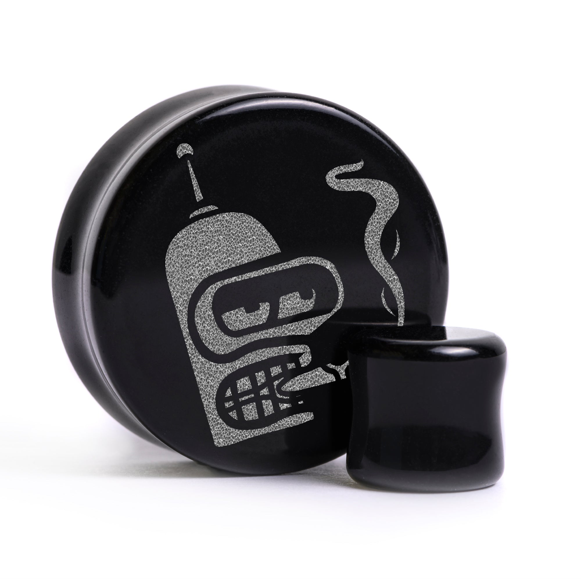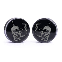 Flat Faced Doubleflared Black Glass Plugs featuring laser engraved “Bender - Futurama'' design.