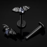 Embrace the eerie spirit of Halloween with this Black Jewelled Bat Black Internally Threaded Titanium Labret Stud. Its sleek Black finish and Black teardrop stone bring a subtle yet spooky charm to your jewellery collection. Crafted with a 1.2mm gauge and an internally threaded design ensuring a secure, comfortable fit, this labret stud is the perfect haunting accessory to cast a shadow of style and mischief wherever you go.