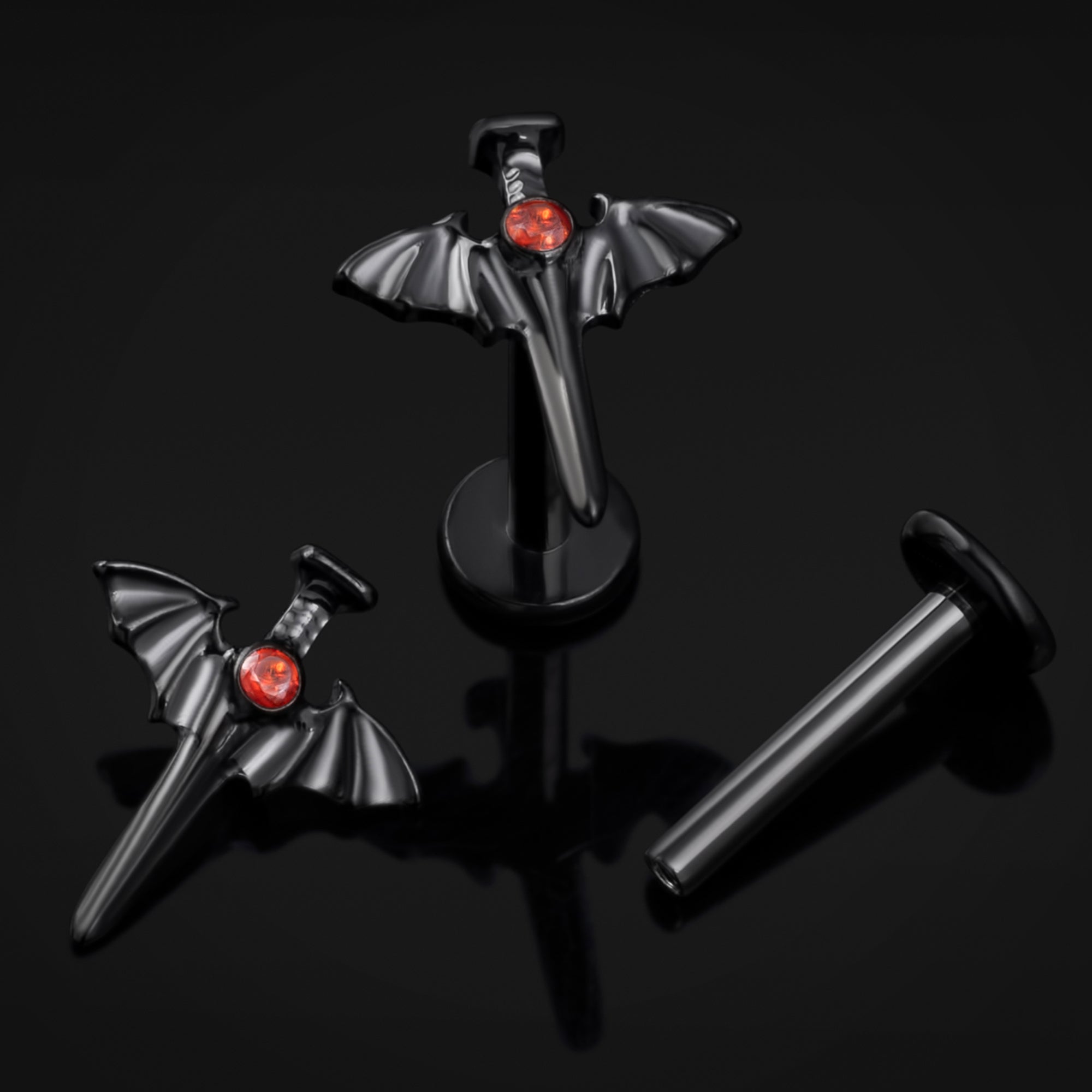 Embrace the eerie spirit of Halloween with this Black Jewelled Bat Wing Sword Labret Stud. Its sleek Black finish and red stone bring a subtle yet spooky charm to your jewellery collection. Crafted with a 1.2mm gauge and an internally threaded design ensuring a secure, comfortable fit, this labret stud is the perfect haunting accessory to cast a shadow of style and mischief wherever you go.