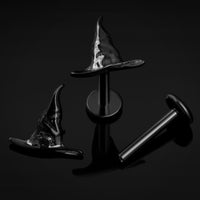 Embrace the eerie spirit of Halloween with this Black Witches Hat Internally Threaded Titanium Labret Stud. Its sleek Black finish and delicate Witches Hat design bring a subtle yet spooky charm to your jewellery collection. Crafted with a 1.2mm gauge and an internally threaded design ensuring a secure, comfortable fit, this labret stud is the perfect haunting accessory to cast a shadow of style and mischief wherever you go.