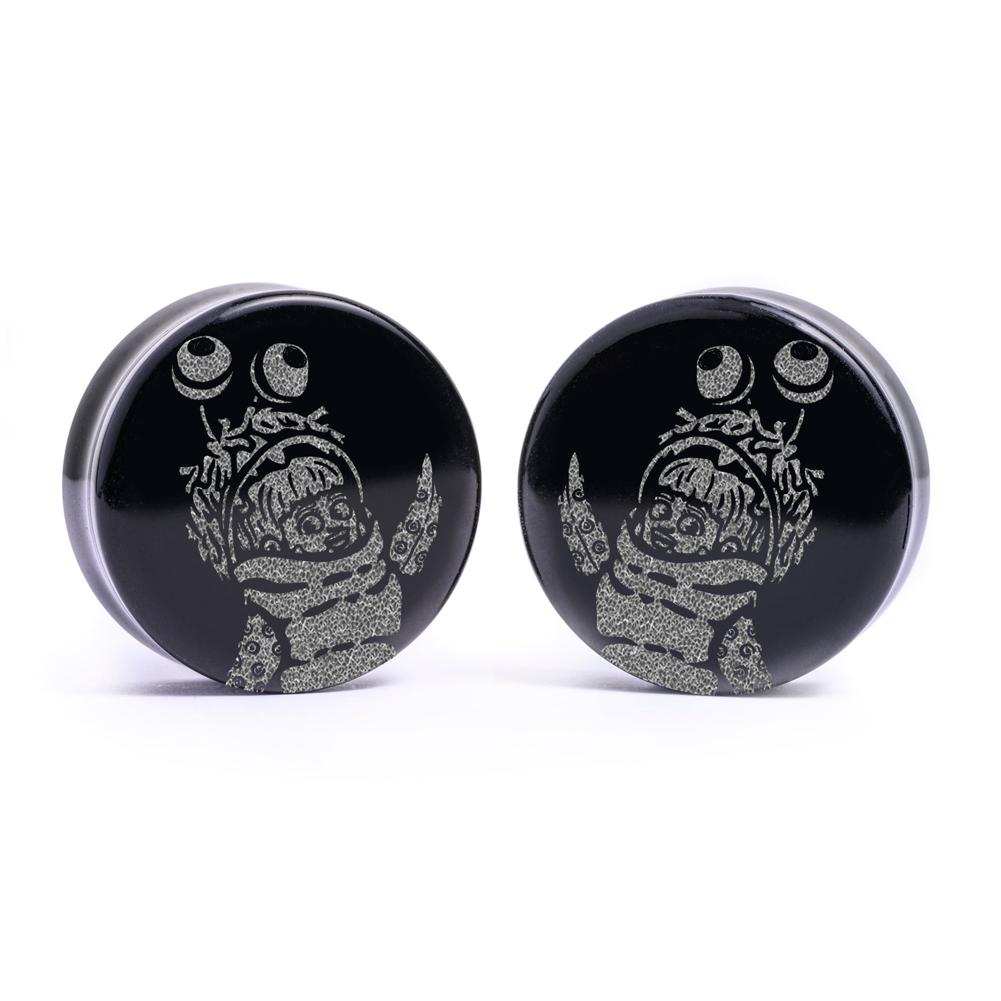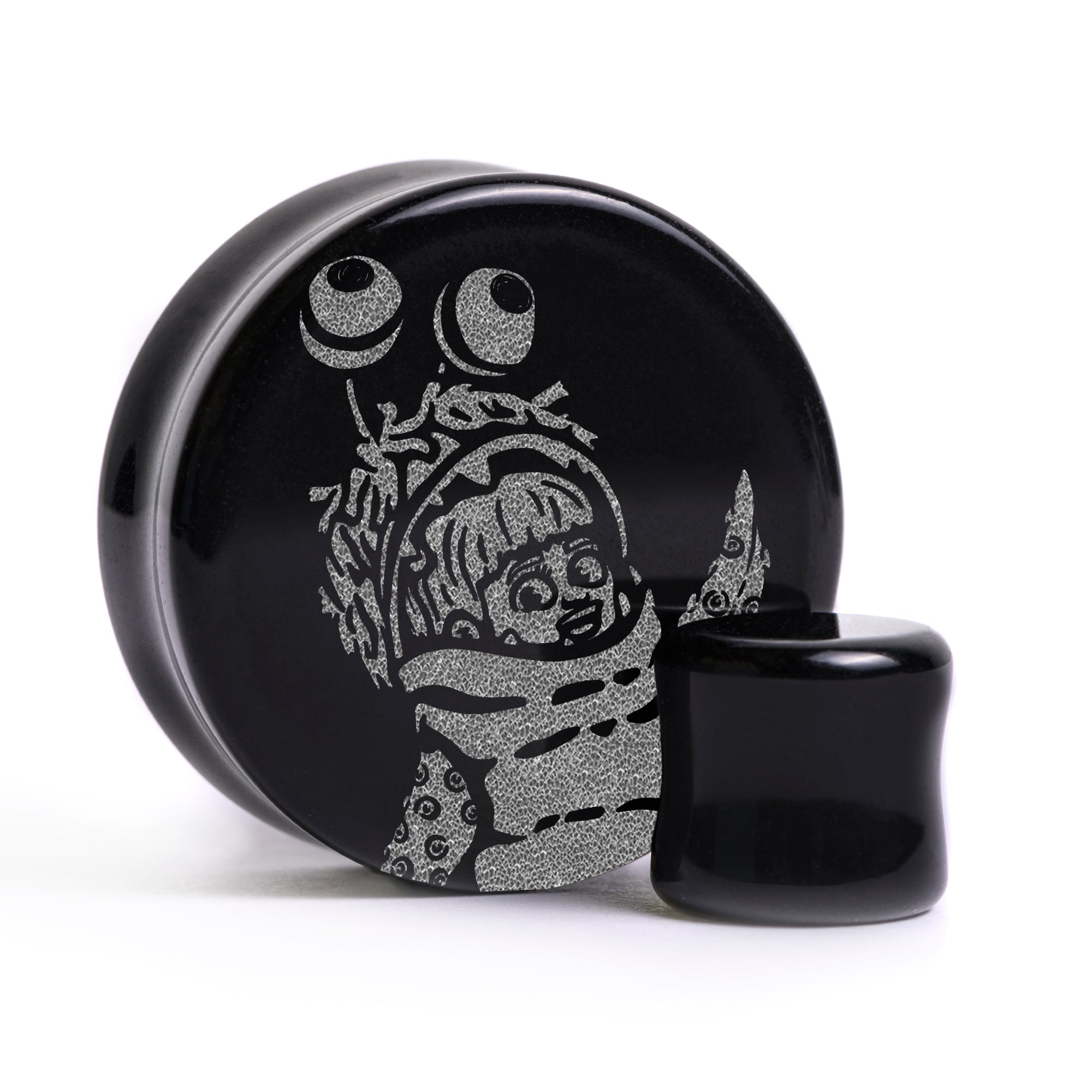 Flat Faced Doubleflared Black Glass Plugs featuring laser engraved “Boo'' design.