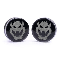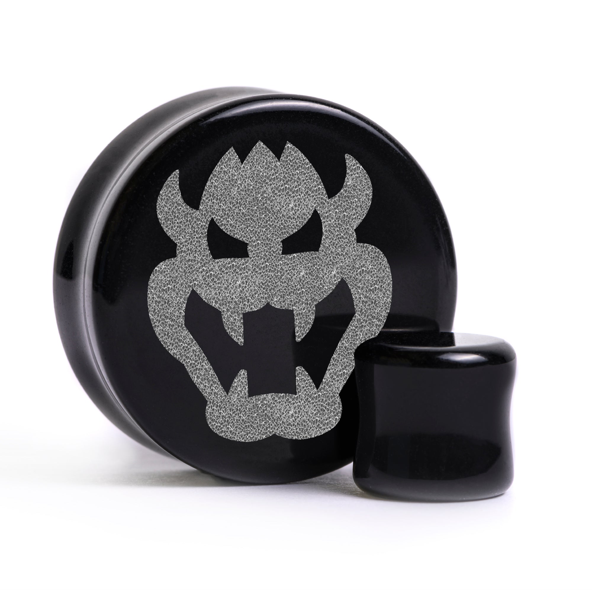 Flat Faced Doubleflared Black Glass Plugs featuring laser engraved “Bowser" e plugs have a flat front and flat back.‚ Glass plugs are known for being smooth, durable and easy to insert.‚ Glass is an inert material which makes them great for people with sensitive ears as they are very unlikely to cause reactions.