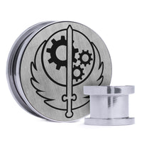Limited Edition, High Quality Silver Steel Double flare Screw Back Brushed Silver & Black Inlay Plugs featuring the laser engraved "Brotherhood Of Steel Logo"