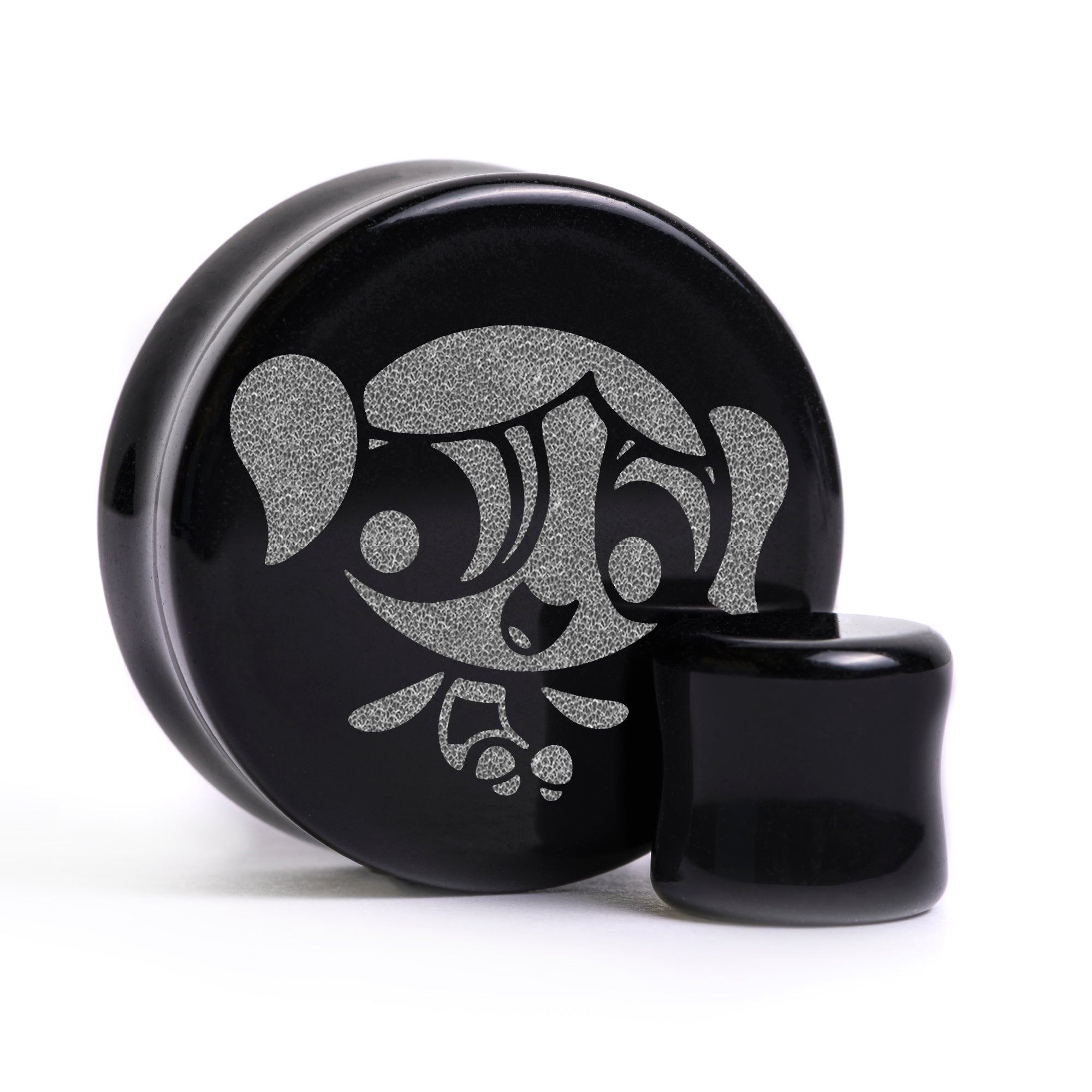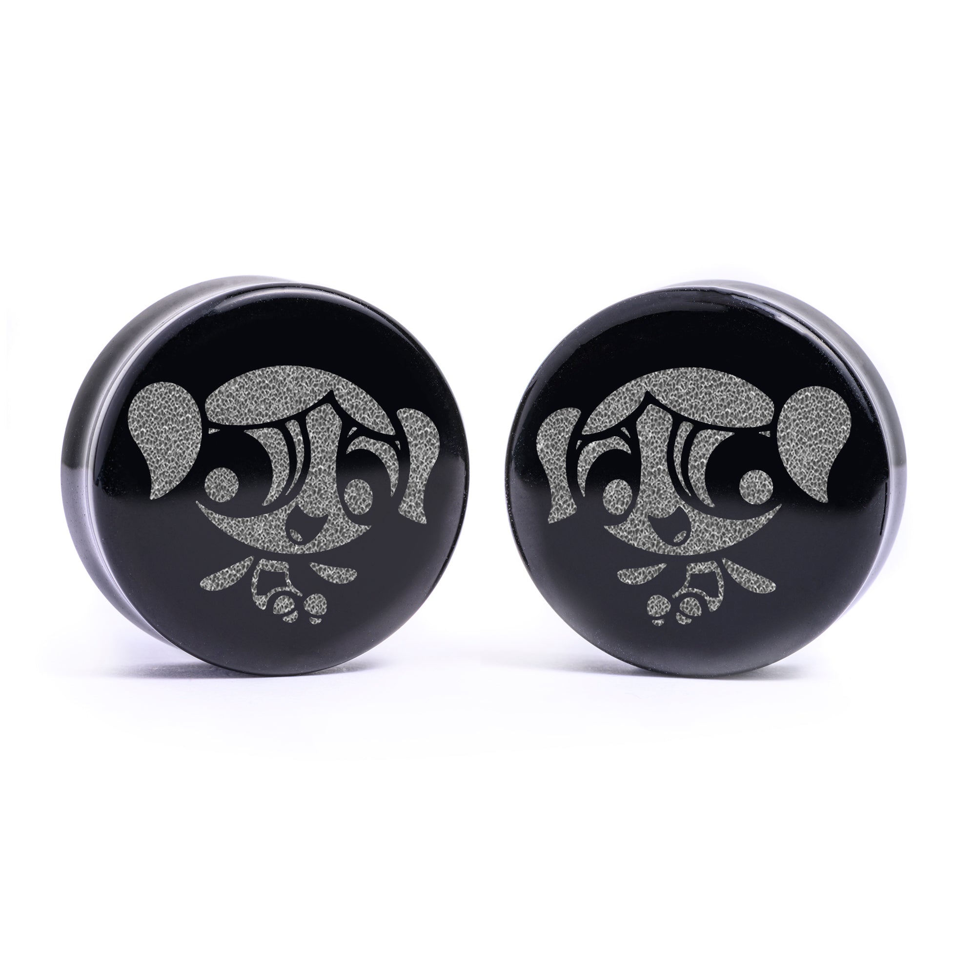 Flat Faced Doubleflared Black Glass Plugs featuring laser engraved “Bubbles' design.