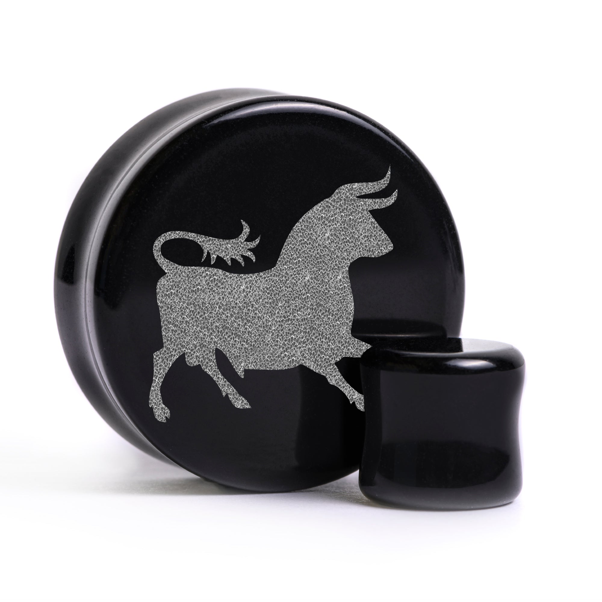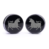 Flat Faced Doubleflared Black Glass Plugs featuring laser engraved "Caesar's Legion Logo" design.