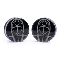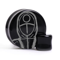 Flat Faced Doubleflared Black Glass Plugs featuring laser engraved “Circle Guard' design.