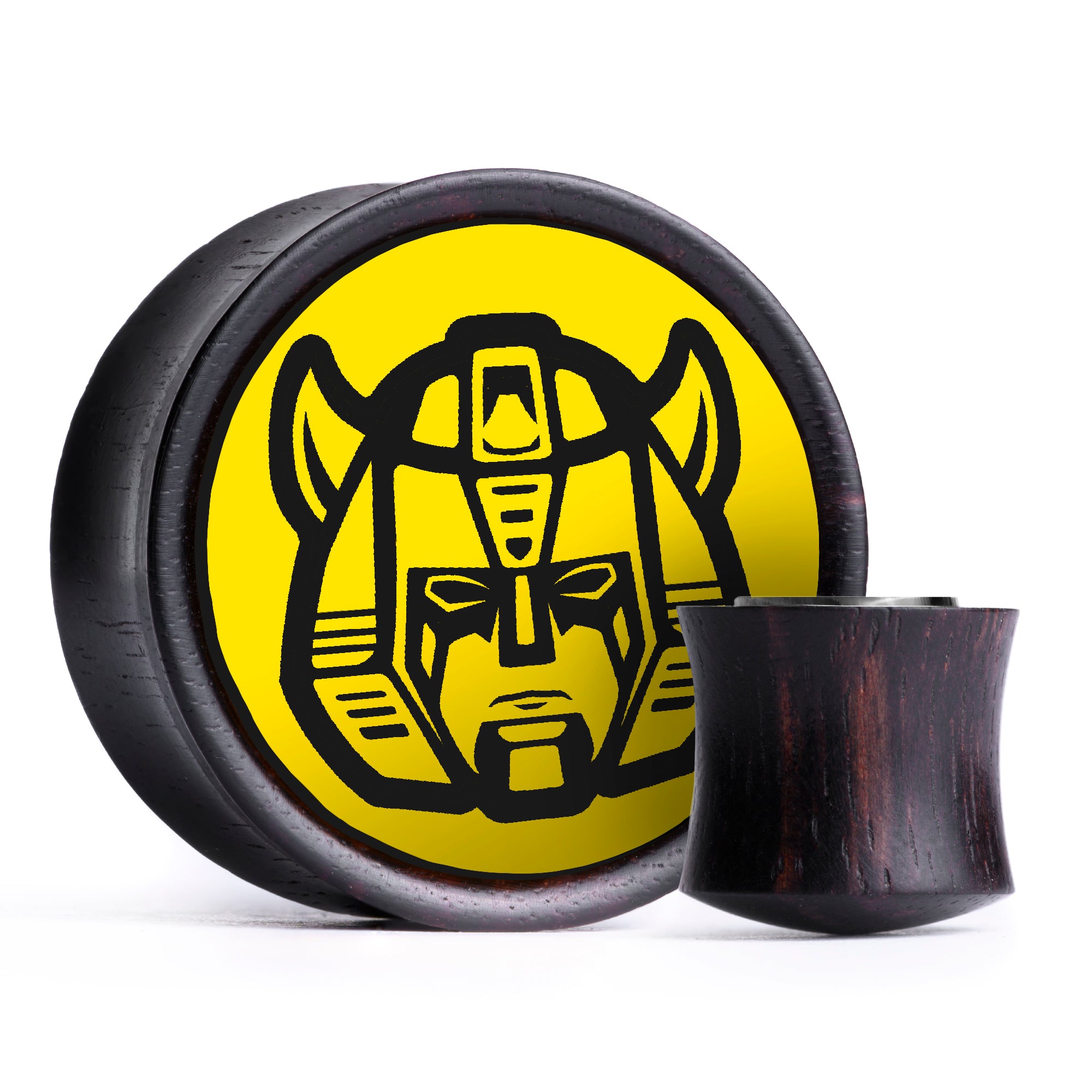 Double flared Ebony Yellow & Black Inlay Wood Plugs featuring the laser engraved “Bumblebee' design.