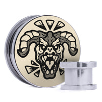 These plugs have a flat front and screw on back. Made from Surgical Steel with an Ivory & Black Acrylic insert.